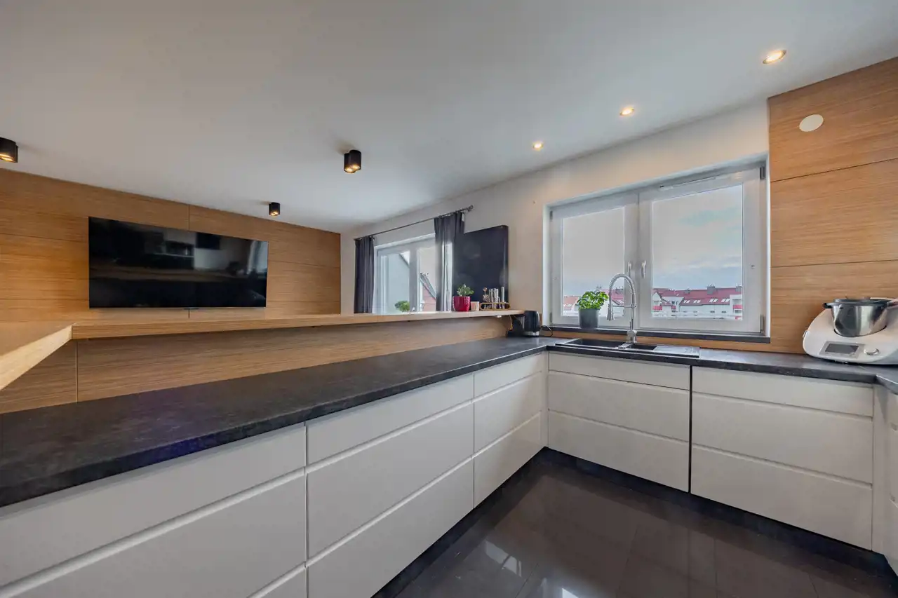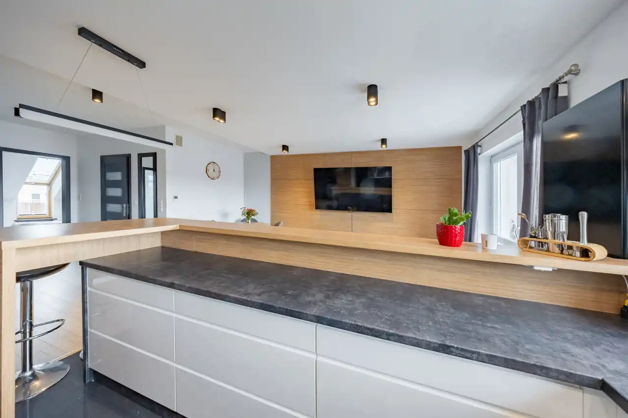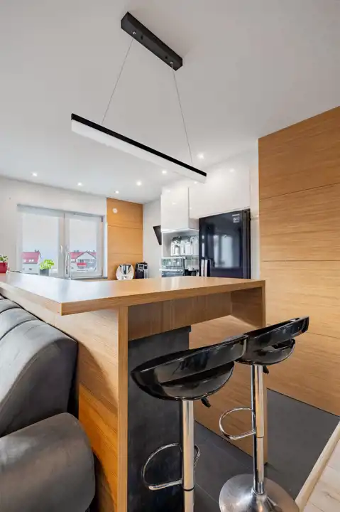 - Przestronny salon z aneksem kuchennym i wyjściem na piękny balkon – serce domu, idealne do wypoczynku i spotkań rodzinnych.