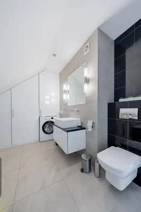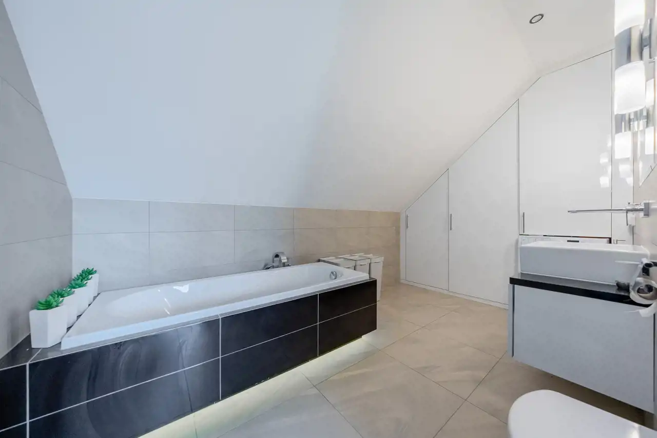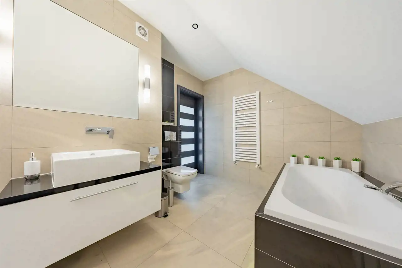 - Łazienka na antresoli – z zabudową na wymiar i ogrzewaniem podłogowym.