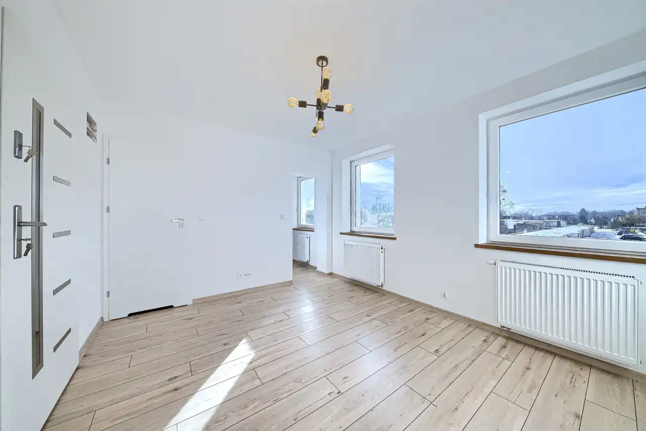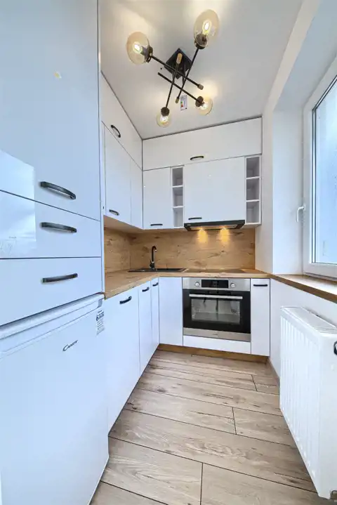 Mieszkanie 1 pokojowe (studio) o powierzchni 20,30 m2 składające się z salonu z otwartą kuchnią. W kuchni zamontowano meble w zabudowie wraz z nowym sprzętem AGD (tj. płyta indukcyjna Elektrolux, piekarnik elektryczny Amica, zmywarka Amica, okap Amica , lodówka Candy). Na podłogach wysokiej jakości panele. W łazience zastosowano system podtynkowy Geberit, prysznic z odpływem liniowym, łazienka jest wyposażona również w umywalkę z szafką.