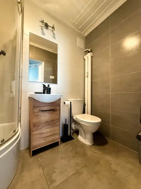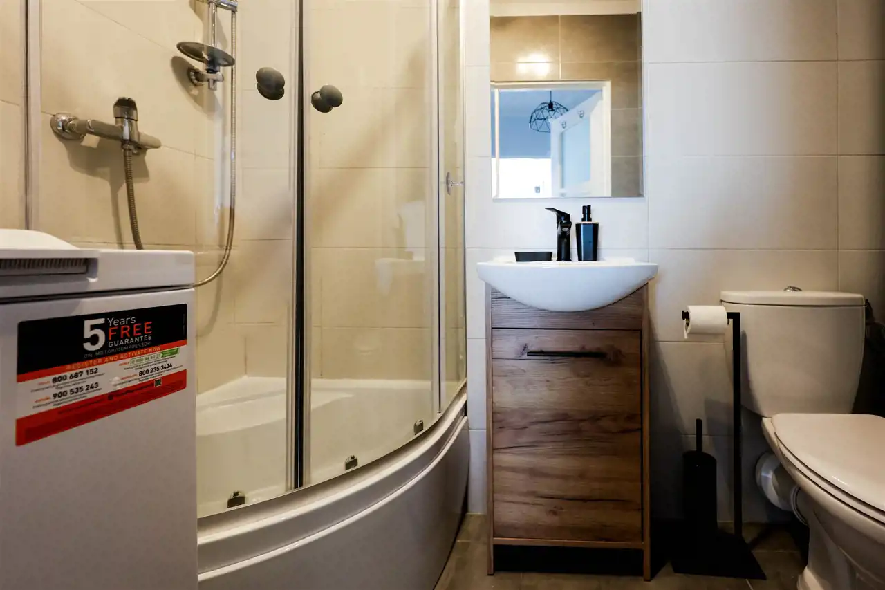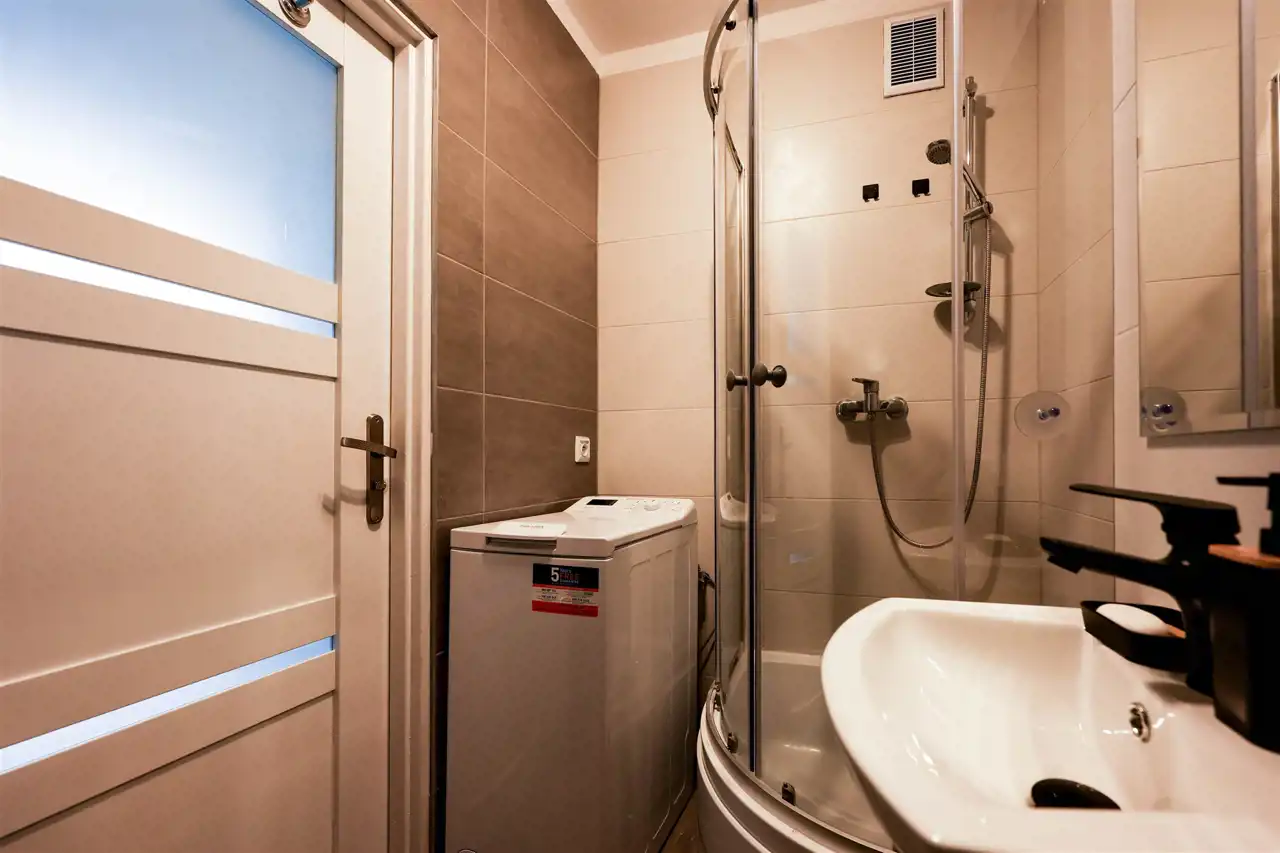 - łazienka z WC, z prysznicem i pralką,