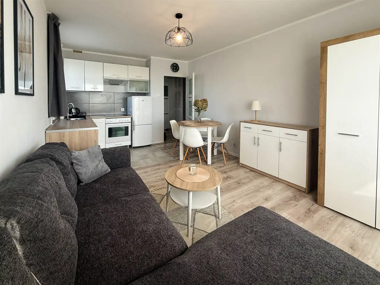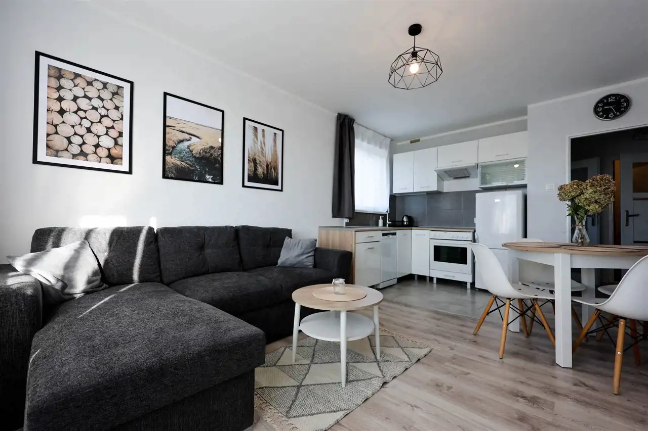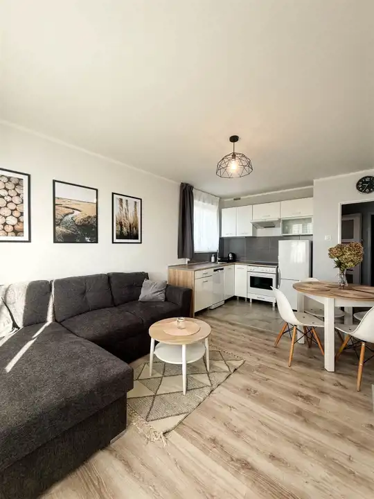 - przestronny salon z aneksem kuchennym, w pełni wyposażony: rozkładana kanapa, stolik, szafa, komoda, stół z krzesłami, kuchnia z dużą ilością szafek, zmywarką, lodówką, piekarnikiem i płytą elektryczną, z salonu wyjście na balkon,
