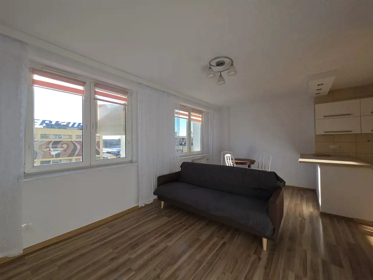 Pokój dzienny z dwoma oknami, z aneksem kuchennym