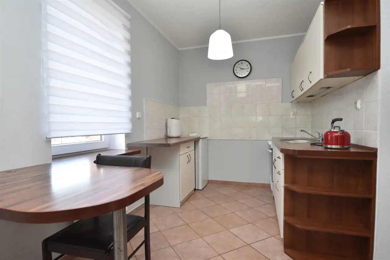 Kuchnia umeblowana i wyposażona w lodówkę i kuchenkę elektryczną.