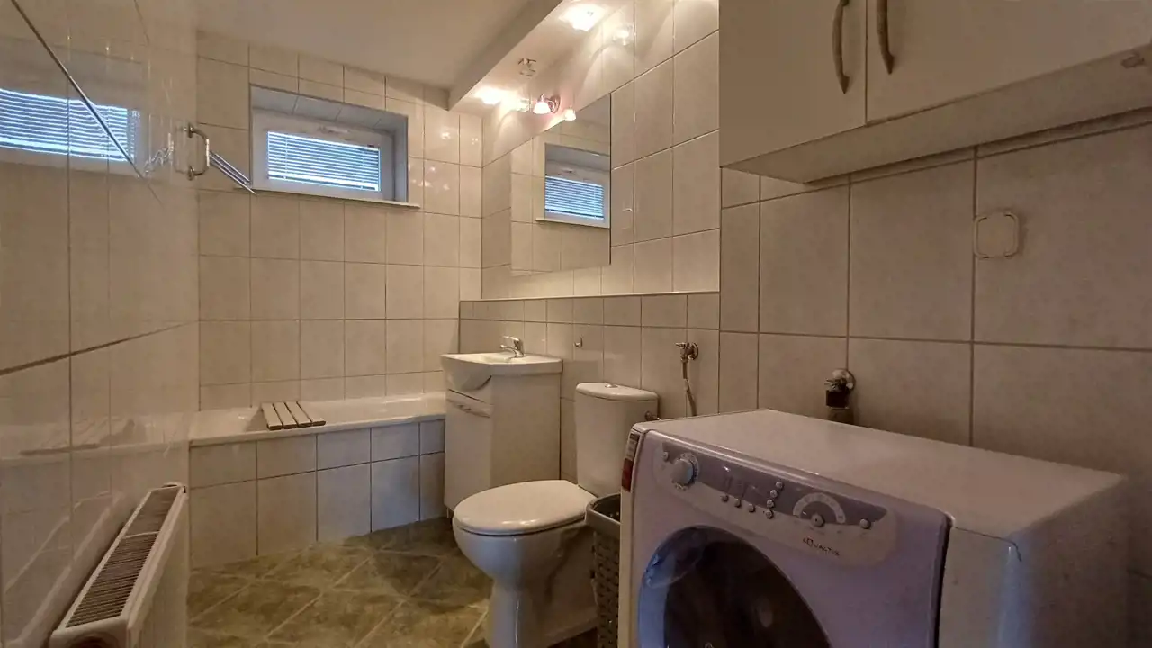 Łazienka z wc wyposażona w wannę i pralkę