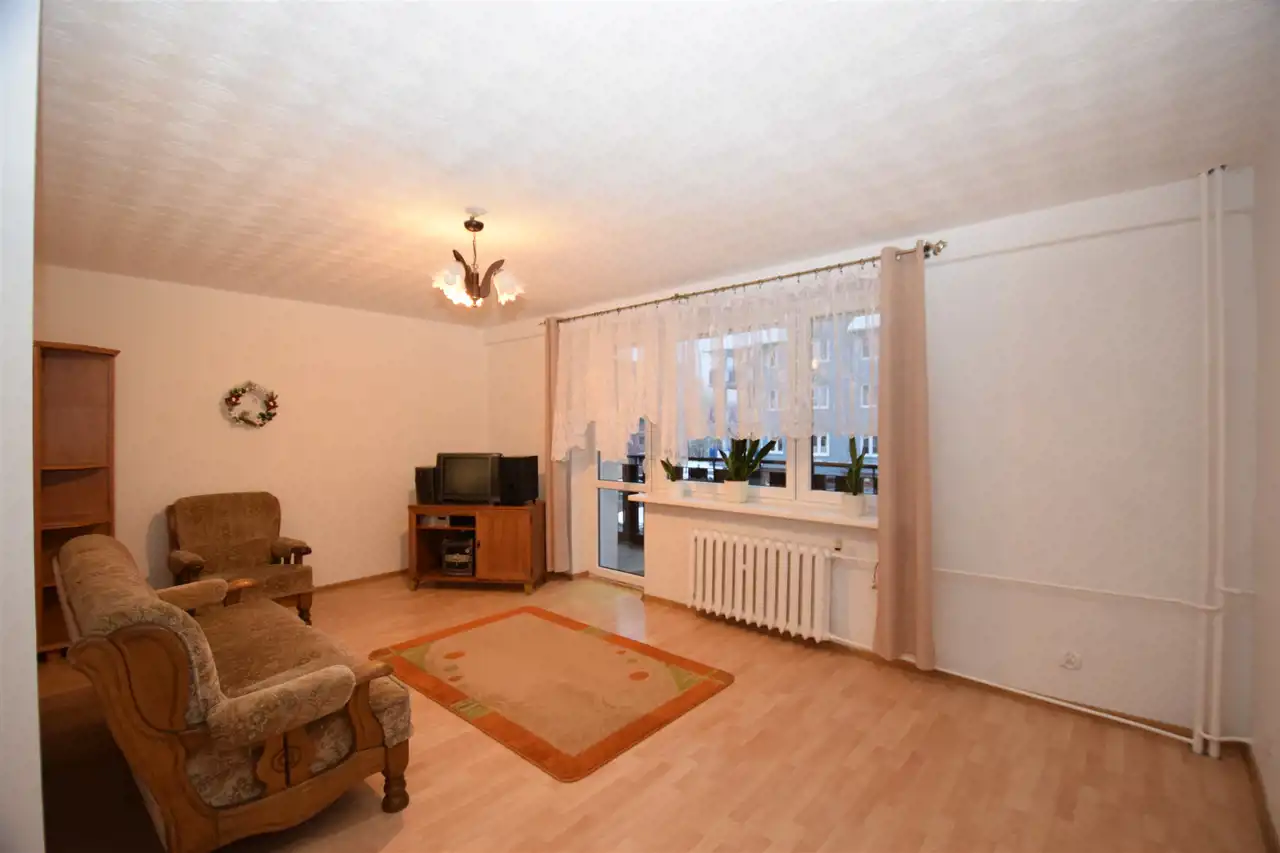 Z salonu wyjście na balkon. Pokój częściowo umeblowany oraz wyposażony w TV