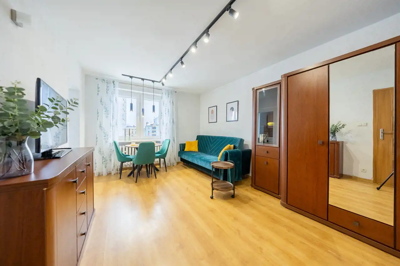 - w salonie: komoda, nowa kanapa, stół z krzesłami, pojemna szafa