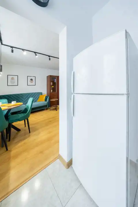 - w kuchni: szafki kuchenne z lodówką i kuchenką gazową