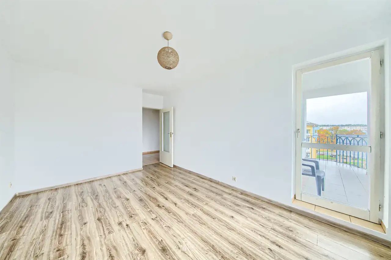 - duży pokój (na podłodze panele) z wyjściem na przestronną loggię,