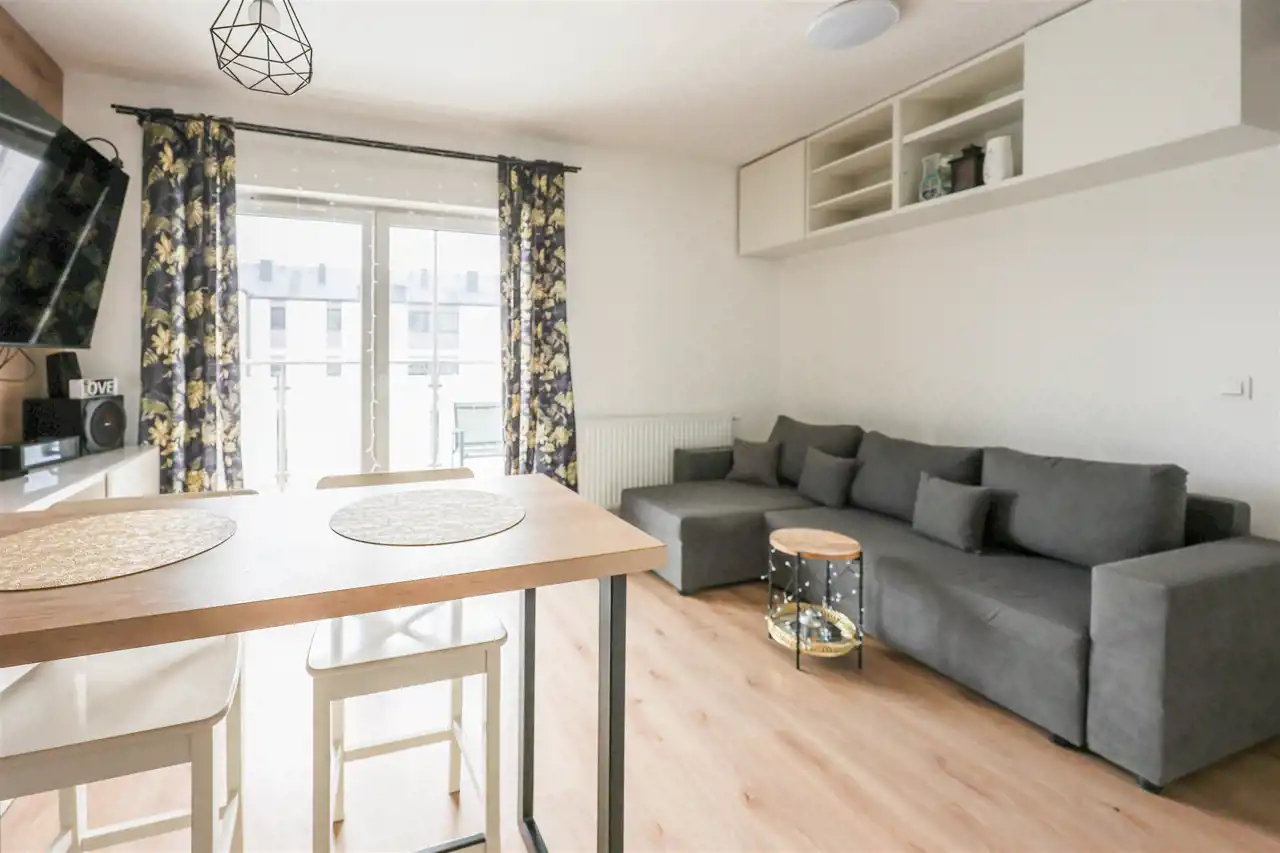 Nieruchomość wynajmowana jest z umeblowaniem. Kuchnia wyposażona w zabudowę kuchenną, sprzęt AGD: zmywarka, płyta indukcyjna, lodówka, okap. W części dziennej narożnik.