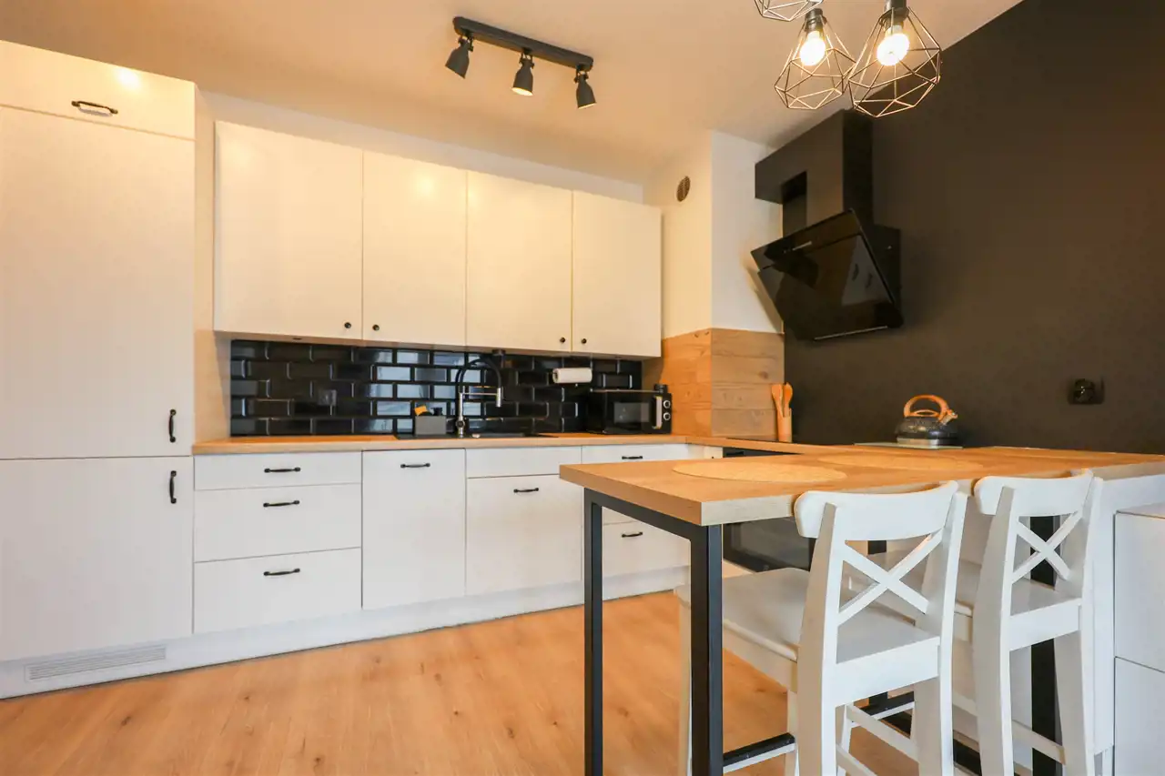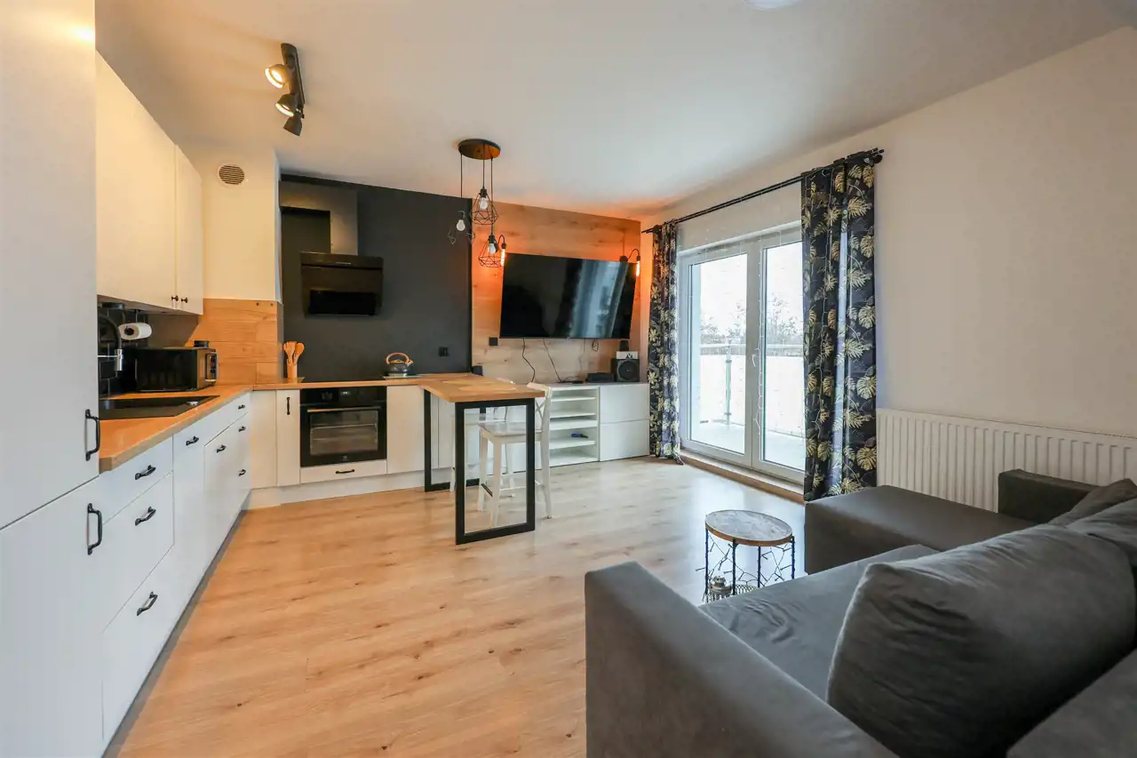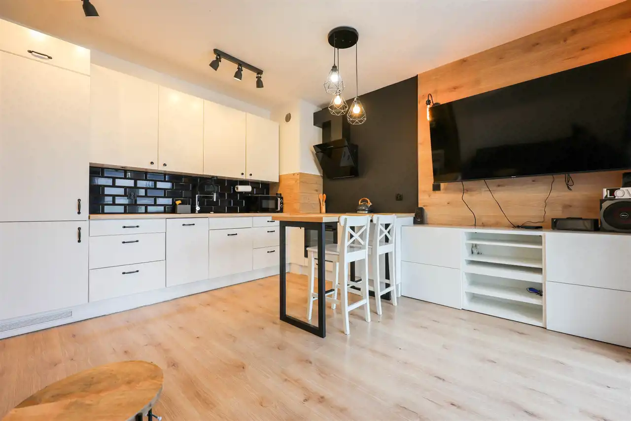 Nieruchomość została zaprojektowana z myślą o maksymalnym wykorzystaniu przestrzeni. Jasny salon połączony z funkcjonalnym aneksem kuchennym tworzy spójną i wygodną strefę dzienną. Nowoczesna zabudowa kuchenna zapewnia komfort codziennego użytkowania, a starannie dobrane wyposażenie podkreśla estetykę wnętrza.