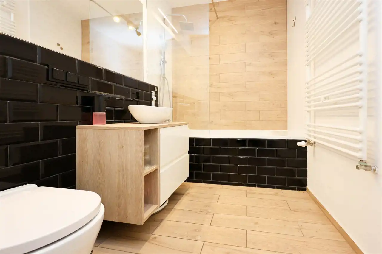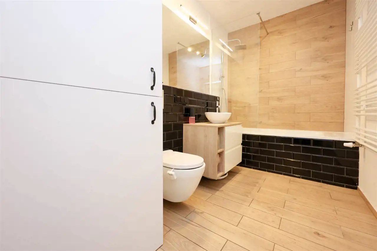 Łazienka została urządzona w stylowy i ponadczasowy sposób. Znajduje się w niej wanna wyposażona w praktyczny, szklany parawan, co łączy funkcjonalność kąpieli i prysznica w jednym rozwiązaniu.