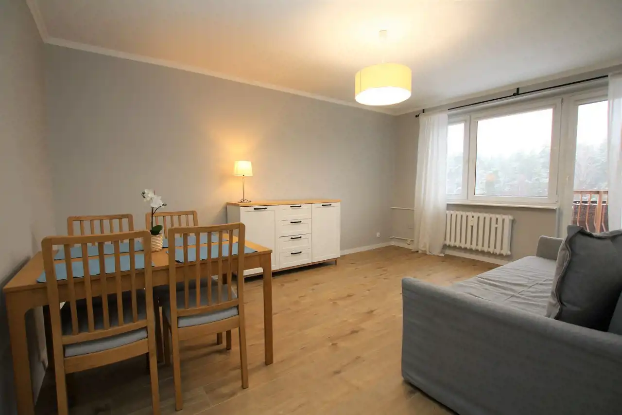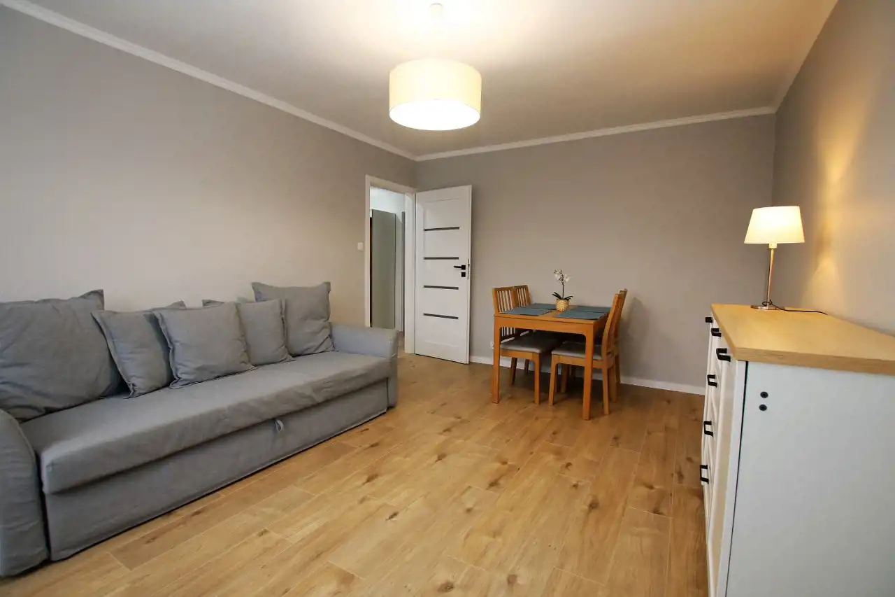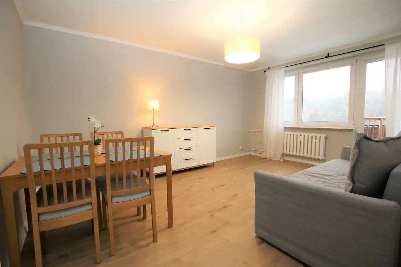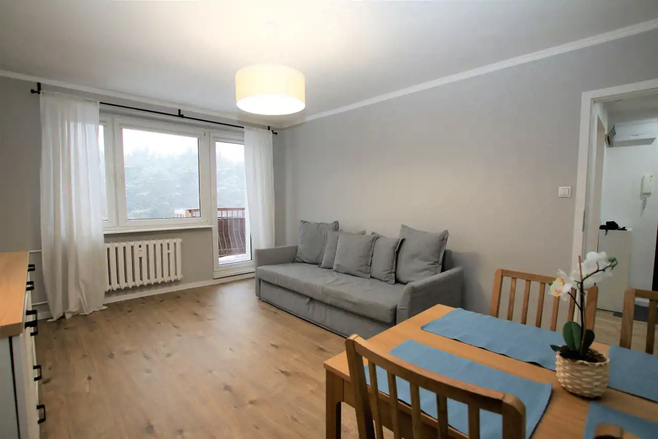 Przestronny salon z wyjściem na balkon – idealne miejsce na relaks po pracy.
