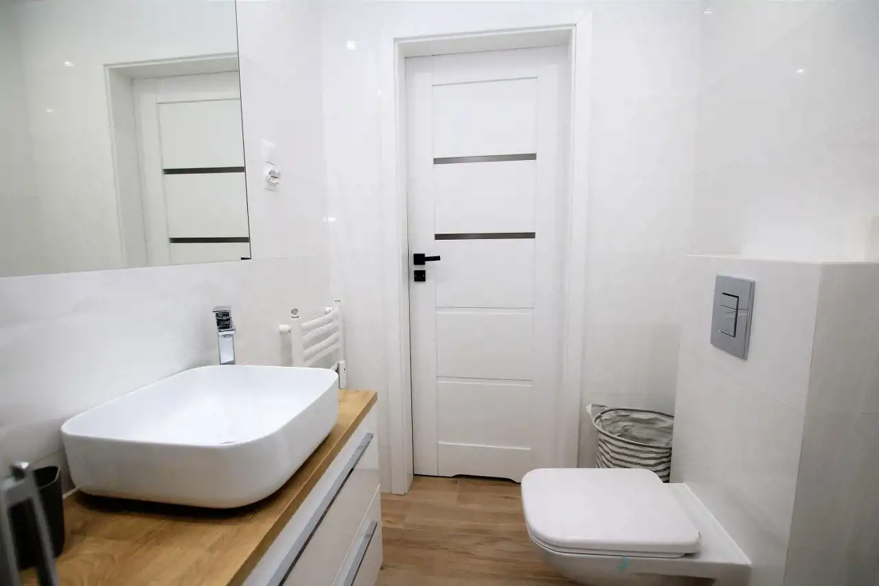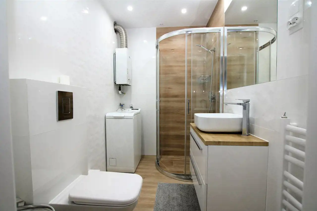 Łazienka nowocześnie urządzona: prysznic, szafka z umywalką, WC podtynkowe.