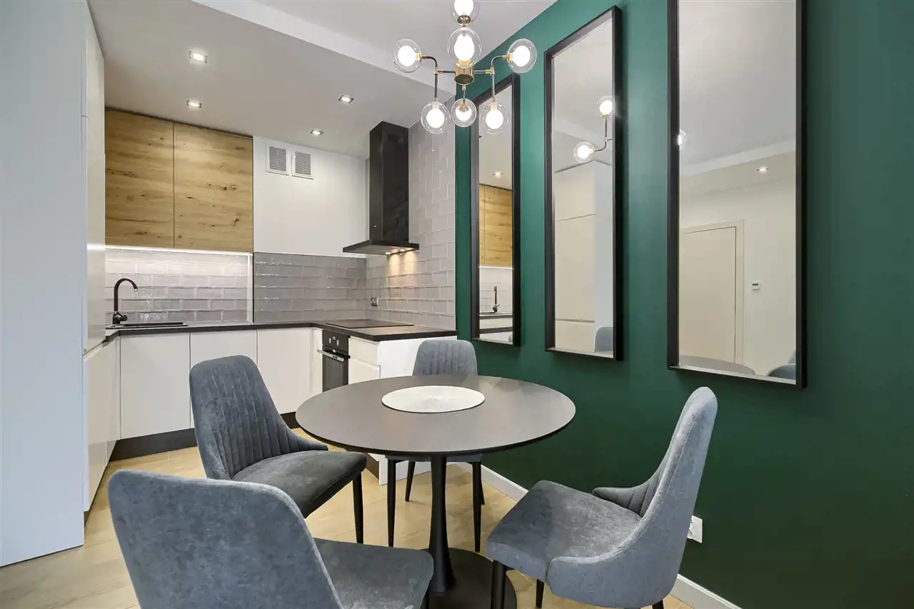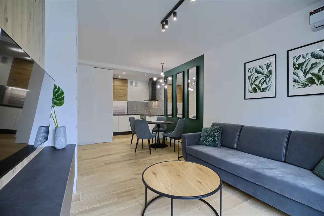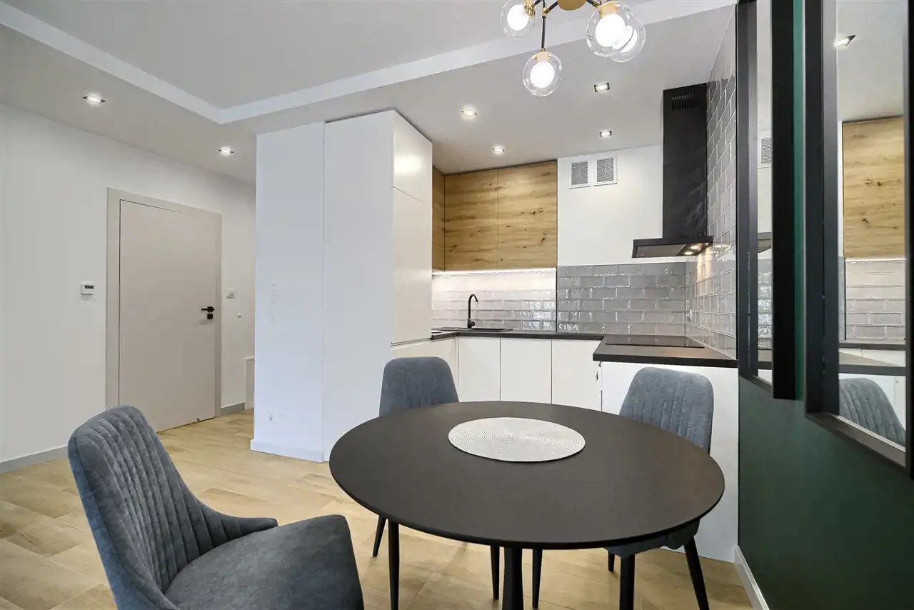 - Pełne wyposażenie: Mieszkanie jest w pełni umeblowane. W aneksie kuchennym znajdziesz wysokiej klasy sprzęt AGD (zmywarka, płyta indukcyjna, piekarnik, lodówka, okap).