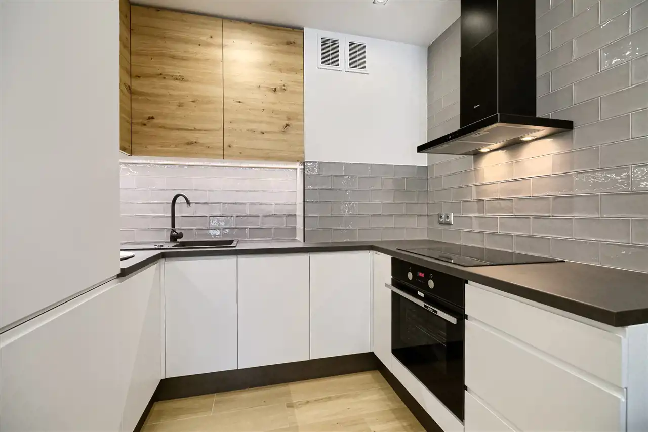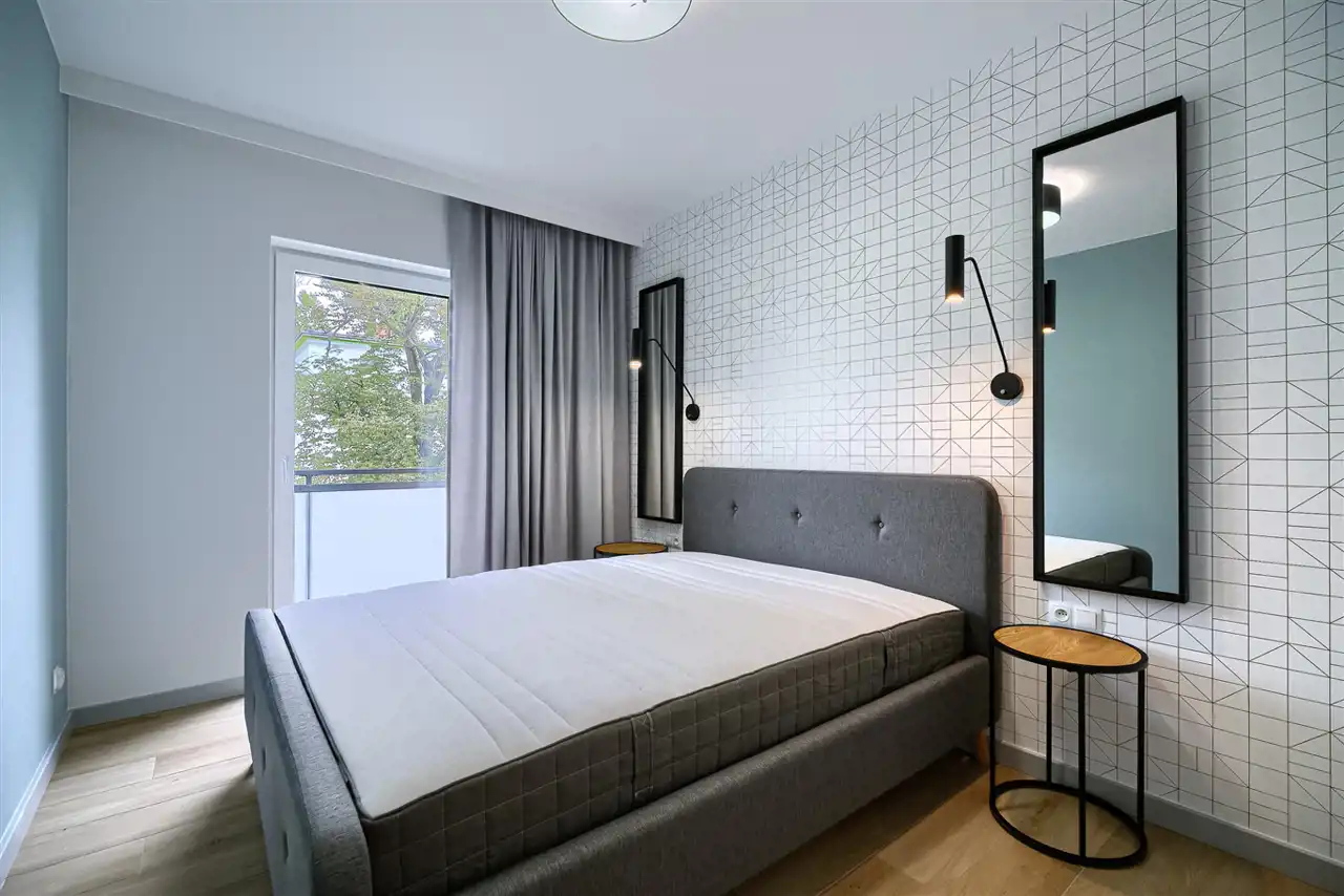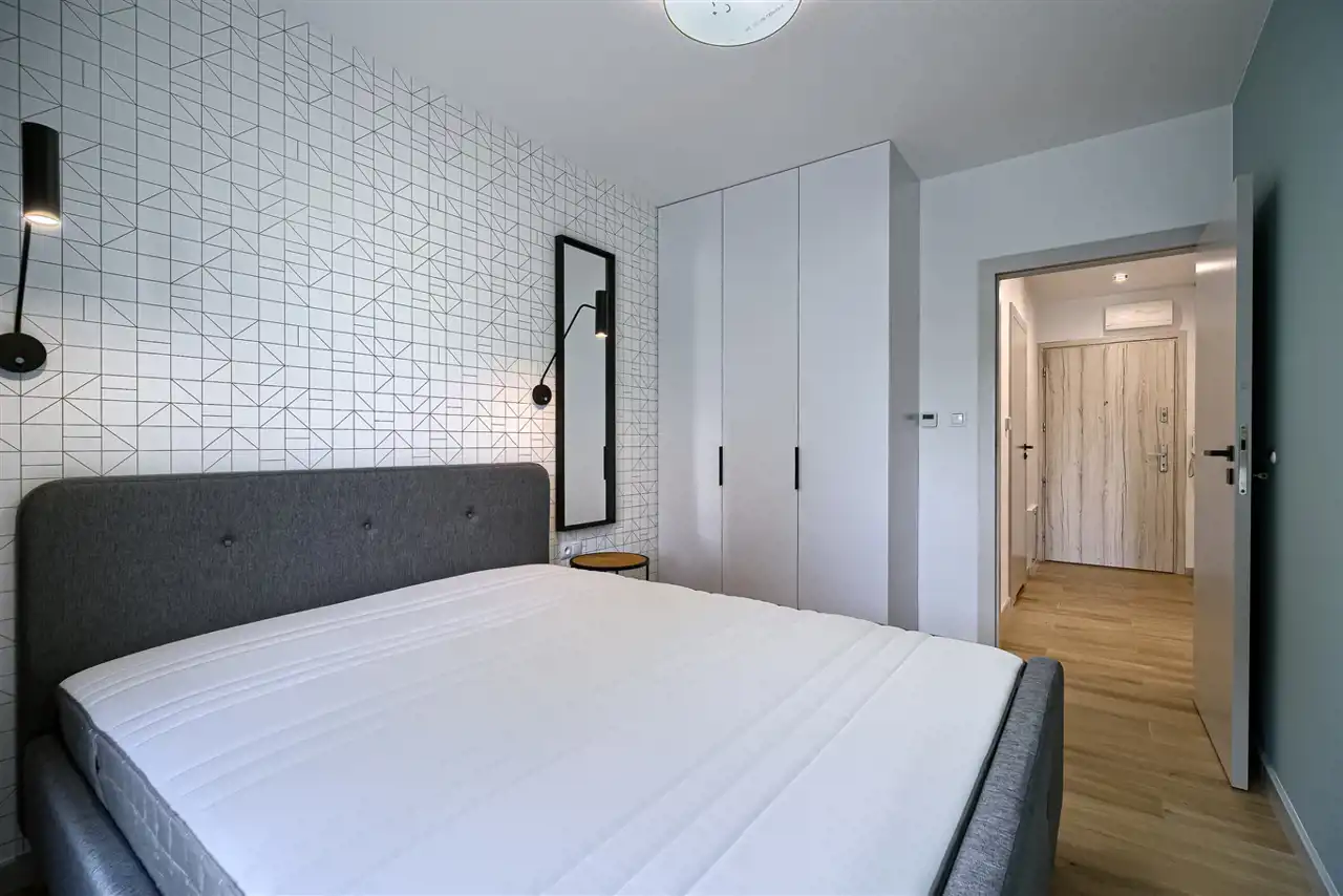 - Pełne wyposażenie: Mieszkanie jest w pełni umeblowane. W aneksie kuchennym znajdziesz wysokiej klasy sprzęt AGD (zmywarka, płyta indukcyjna, piekarnik, lodówka, okap).