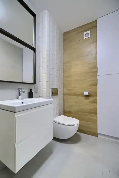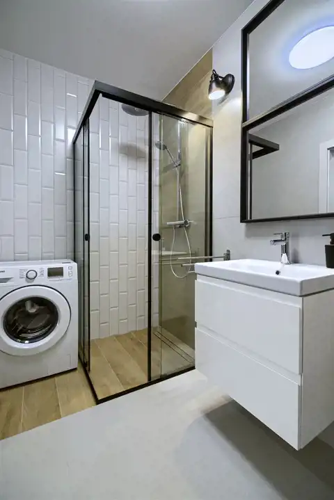 - Łazienka: Wyposażona w nowoczesną kabinę prysznicową i pralkę.