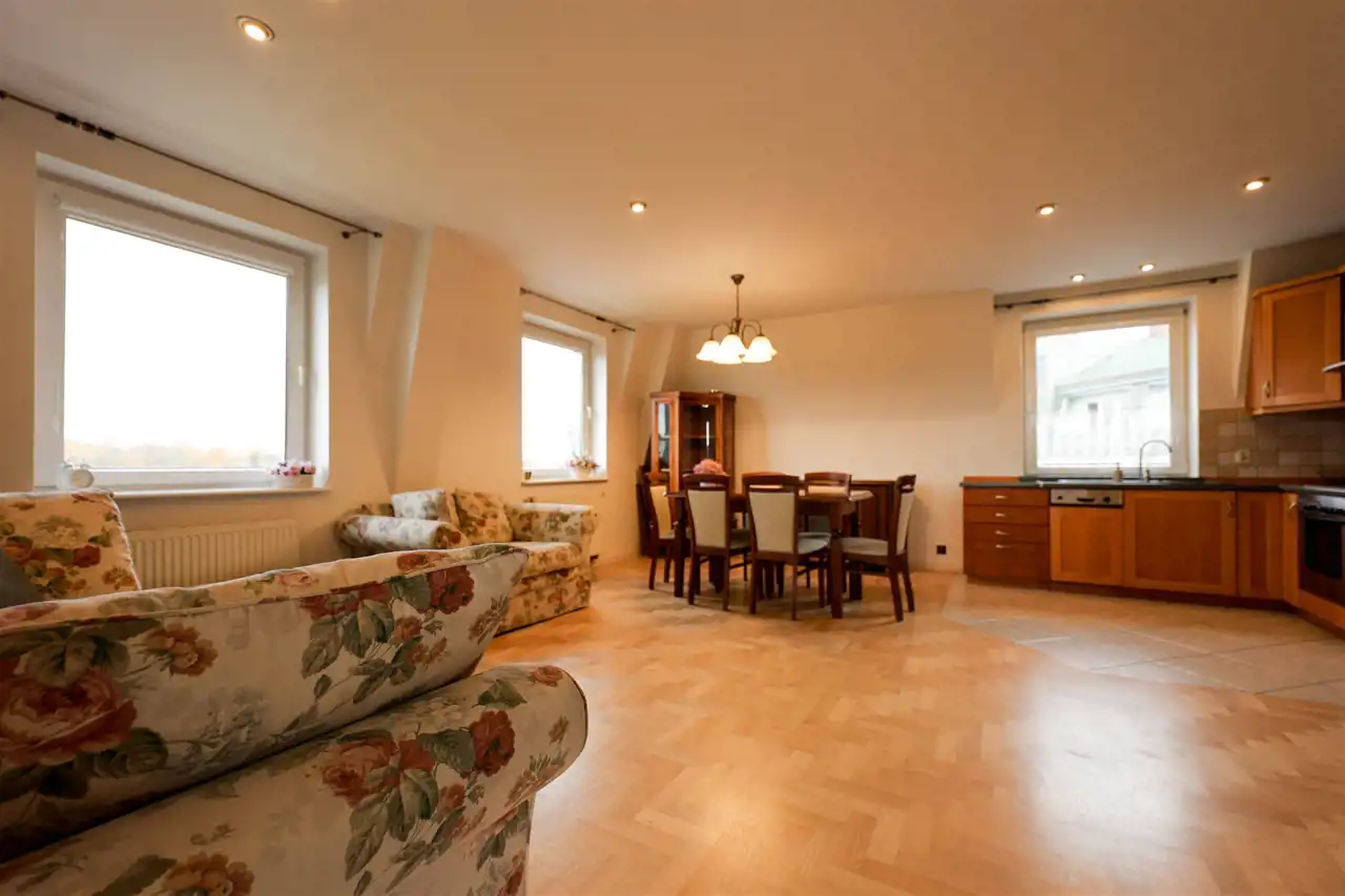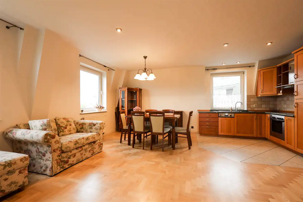 - salon z aneksem kuchennym oraz jadalnią. Meble kuchenne wraz ze sprzętem AGD. W salonie kanapa z funkcją spania. W części jadalnianej stół z krzesłami oraz komoda i witrynka.