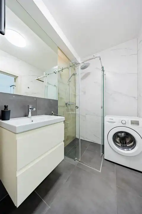 - łazienka z kabiną prysznicową wyposażona w pralkę