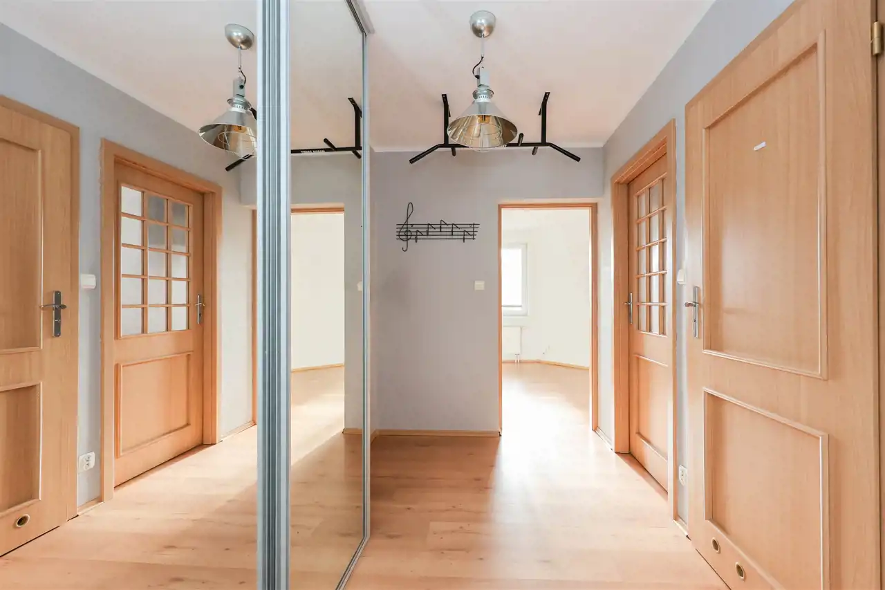 przedpokój o powierzchni 4,55 m² z pojemną lustrzaną szafą w zabudowie.
