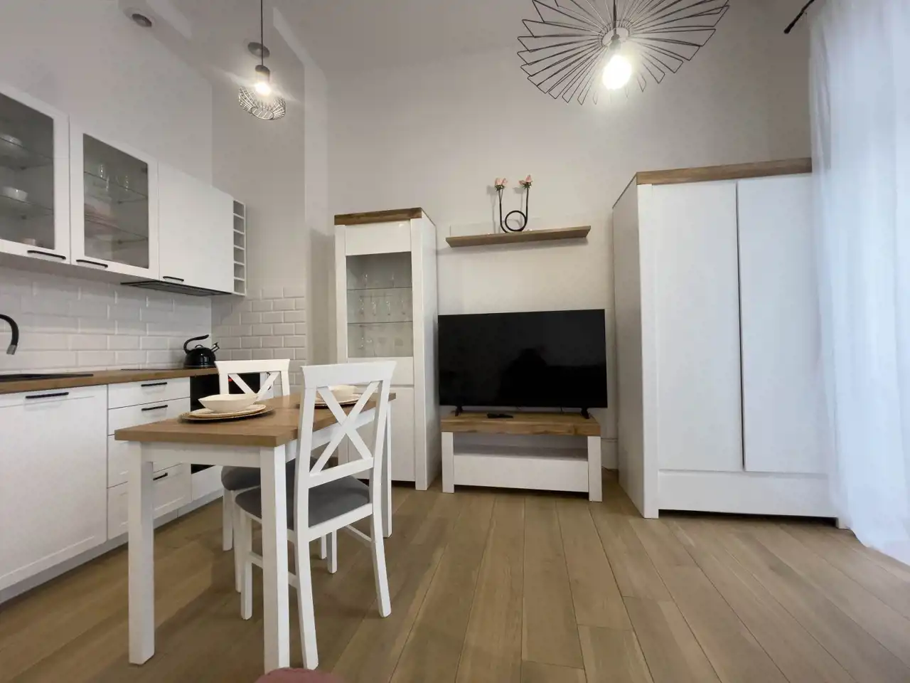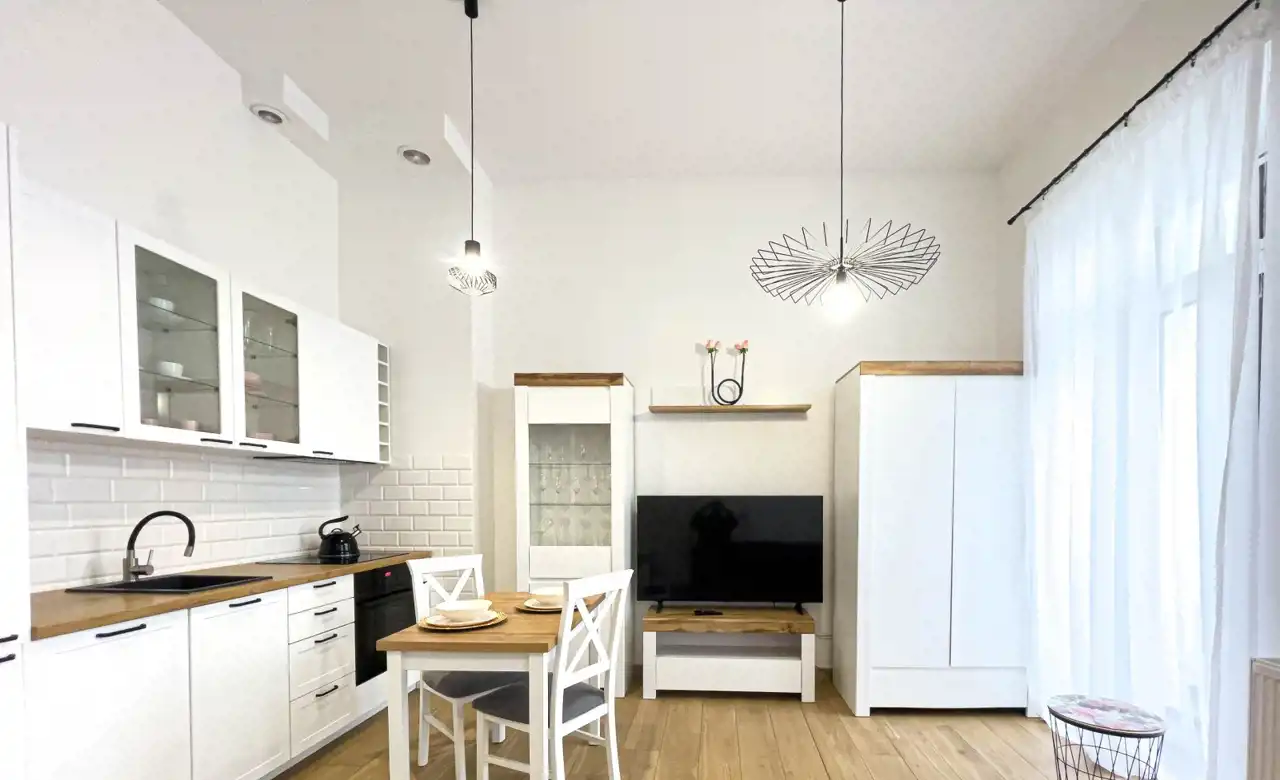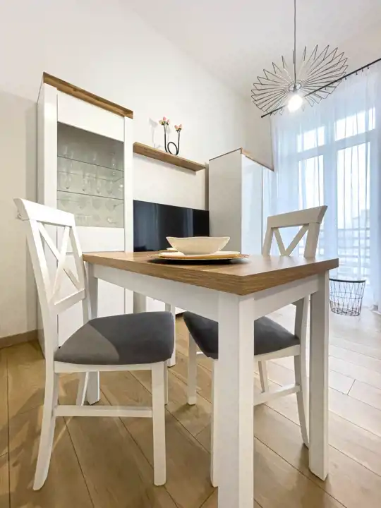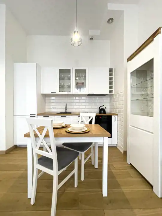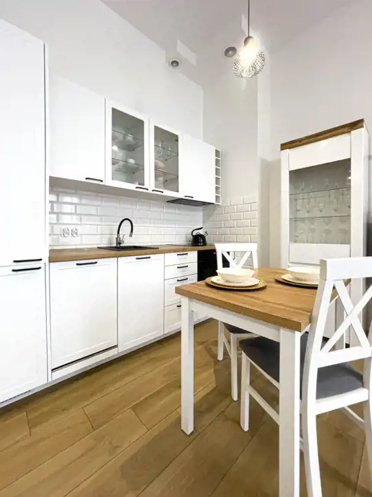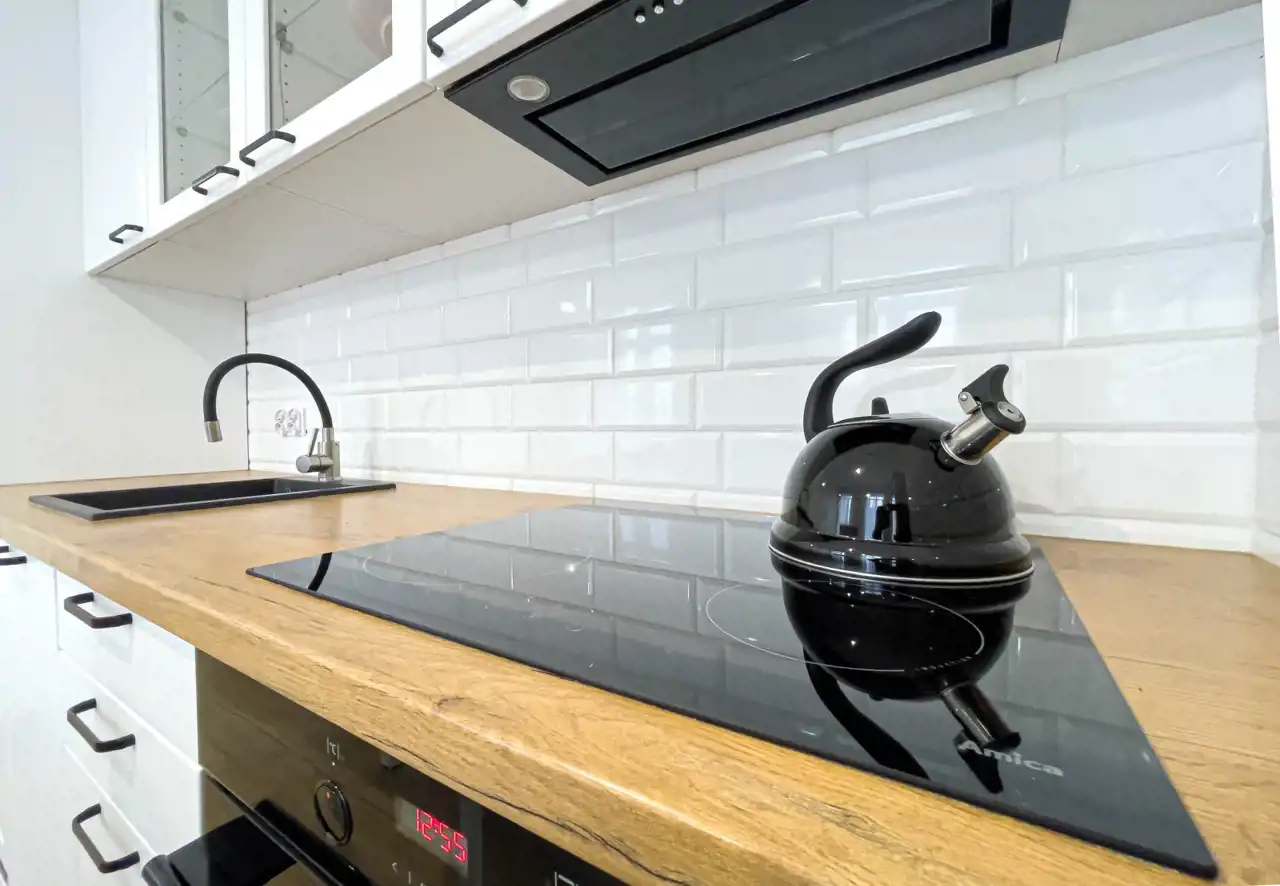 Kuchnia z zabudową kuchenna ze sprzętami AGD (płyta indukcyjna, piekarnik, lodówka, zamrażarka, zmywarka) wyposażona.