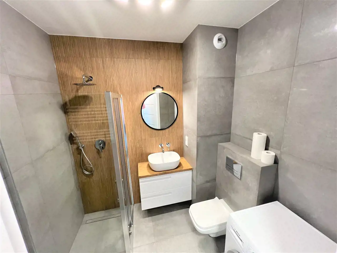 Łazienka razem z wc, wyposażona w kabinę prysznicową i pralkę, ogrzewanie podłogowe.