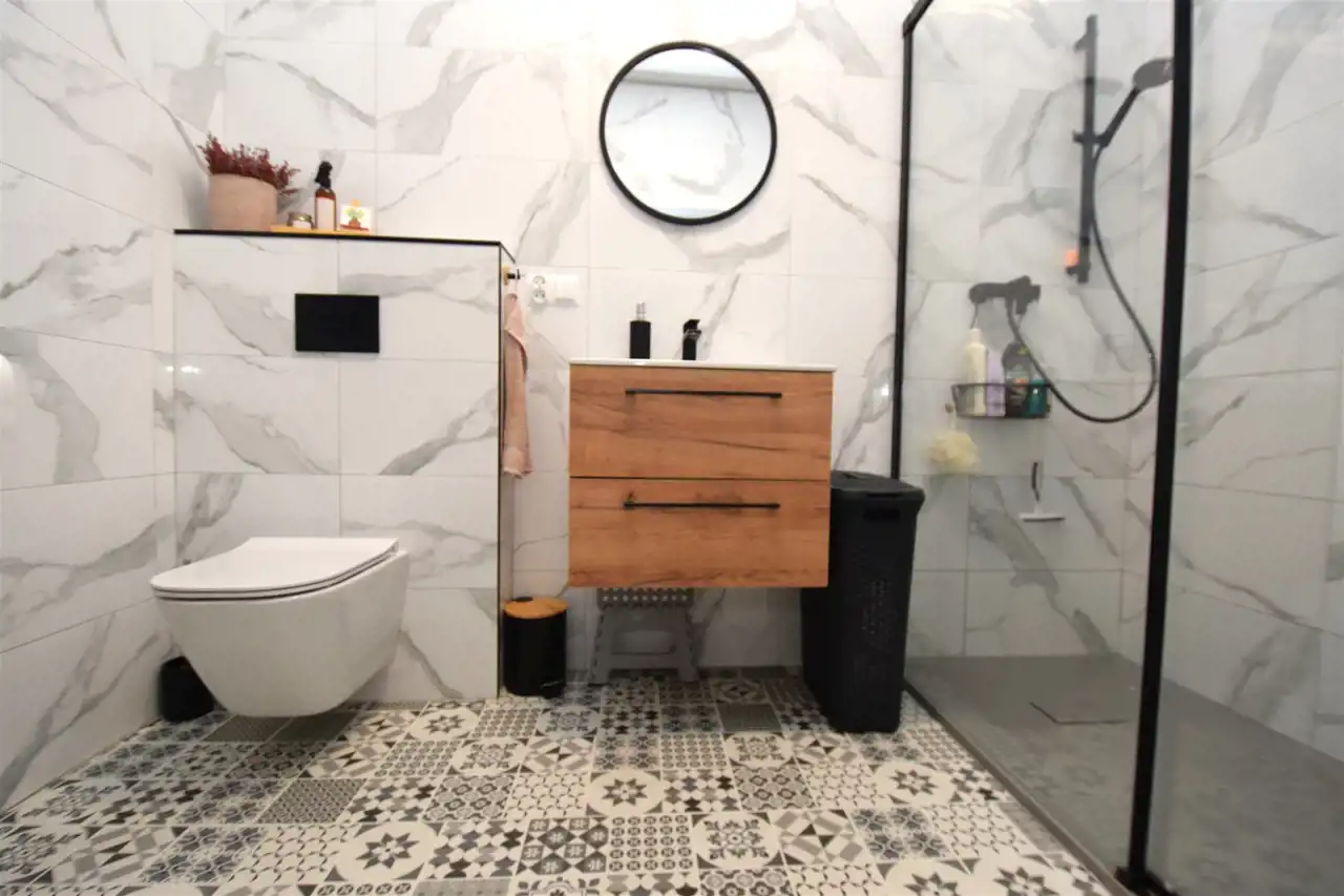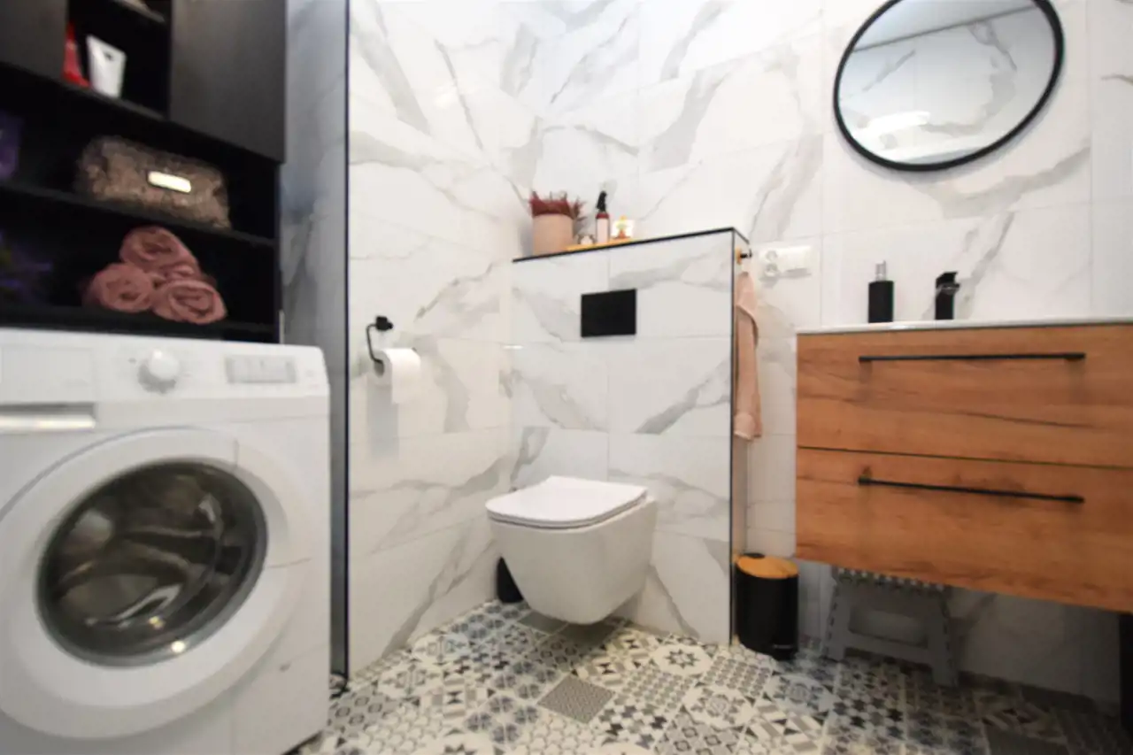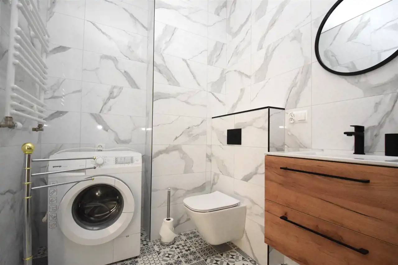 Łazienka o pow. 5,40m2 umeblowana i wyposażona w pralkę
