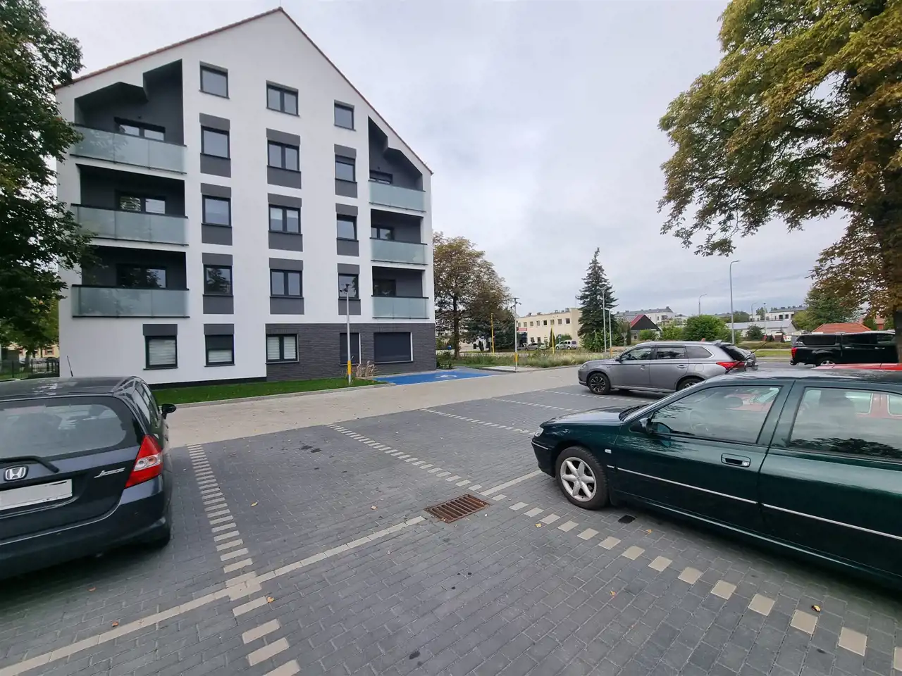 Przy bloku parking dla aut osobowych.