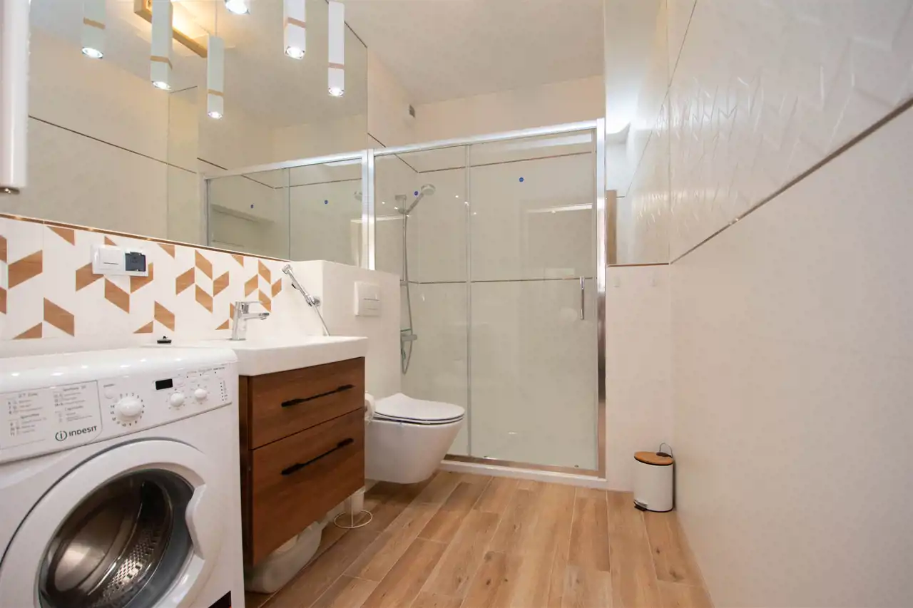- łazienka z wc o pow. 5,14 m 2 , została wykończona w nowoczesnym stylu, z wysokiej jakości armaturą, co zapewnia komfort codziennego użytkowania. Na wyposażeniu pralka.