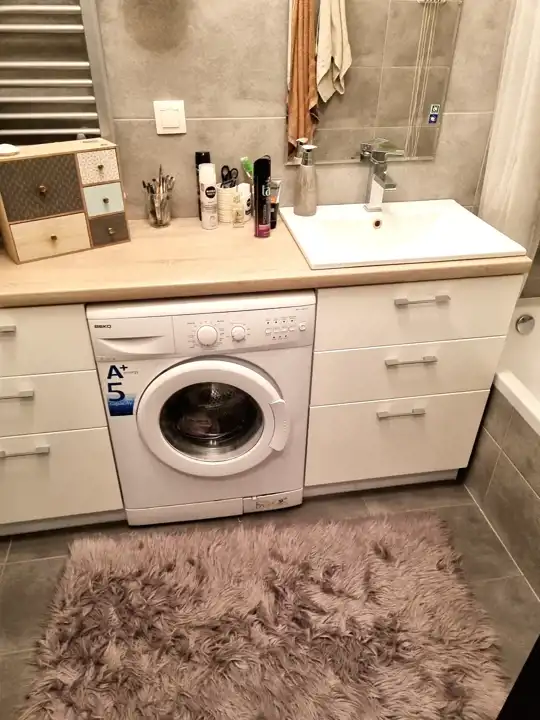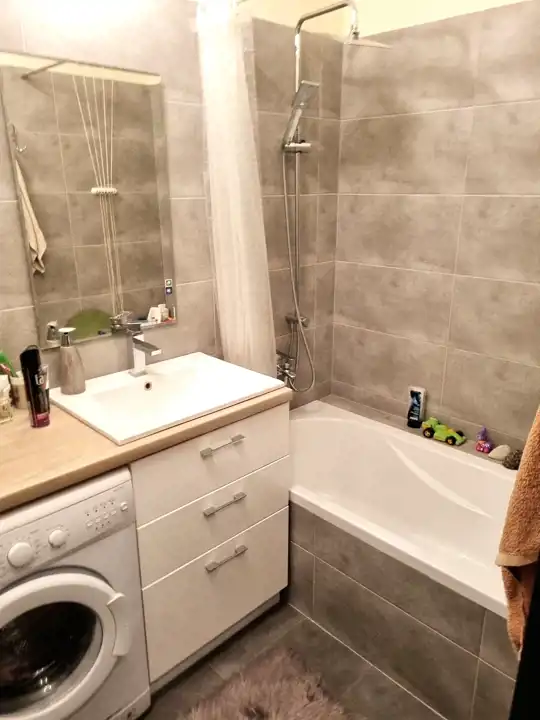 Łazienka z wanną w nowej glazurze, wyposażona w pralkę.