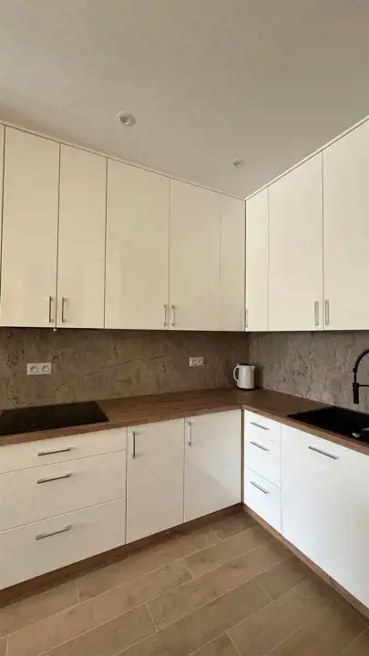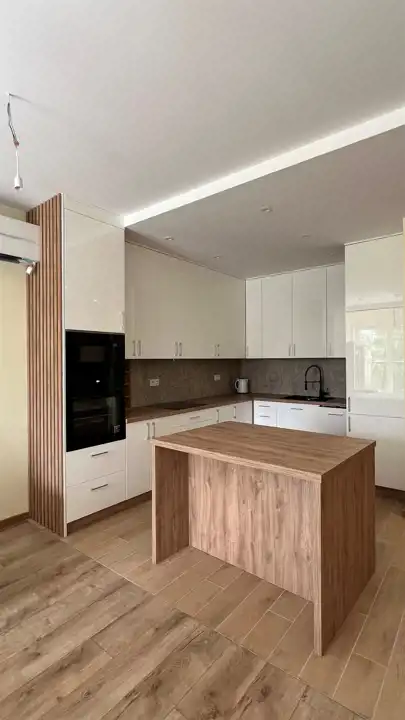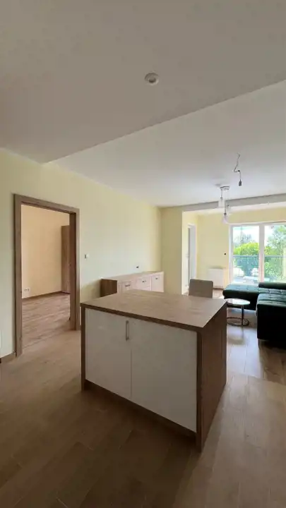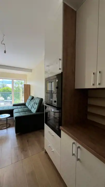 Salon z aneksem kuchennym: W salonie znajduje się duży nowy narożnik (z funkcją spania), dwa stoliki kawowe, pojemna komoda oraz oszklona witryna. Kuchnia w pełni wyposażona w nowoczesne oraz nowe sprzęty AGD. Lodówka w zabudowie. Funkcjonalna wyspa z miejscem do gotowania czy wspólnych posiłków