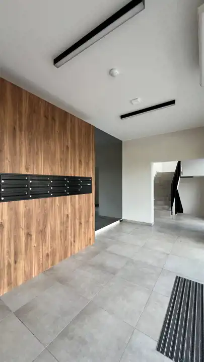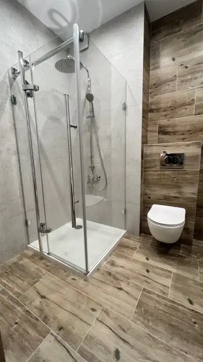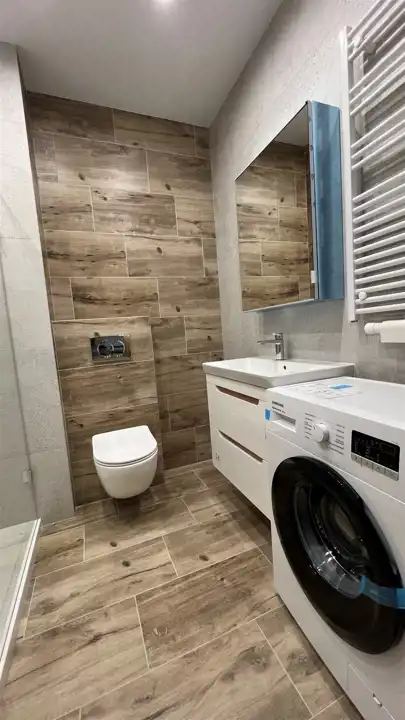 - Łazienka: Elegancka łazienka, w której znajdziesz nową pralkę automatyczną.