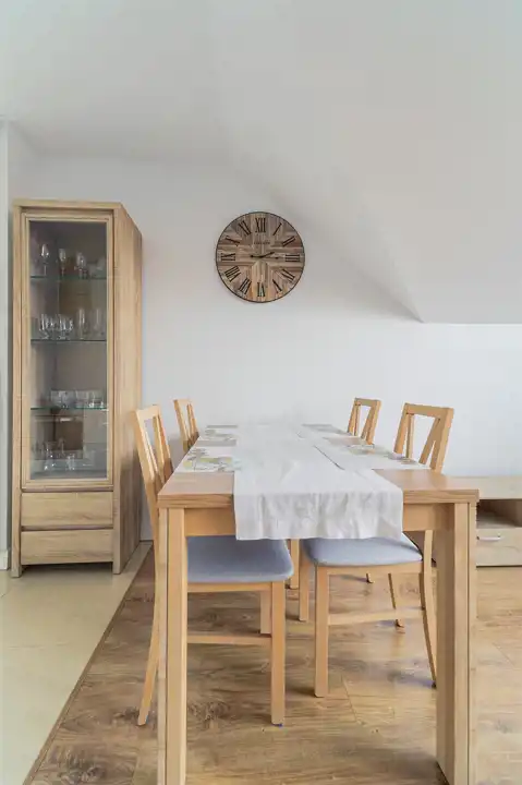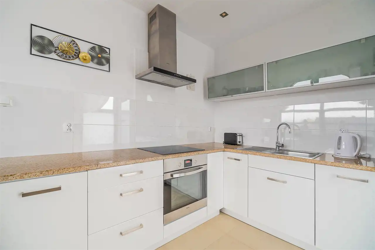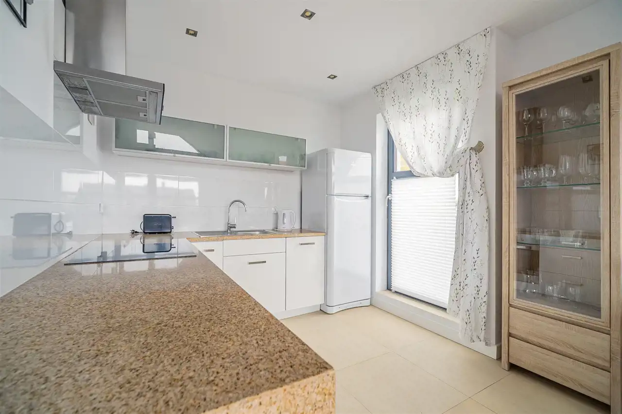 - Nowoczesna zabudowa kuchenna z wysokiej klasy sprzętem AGD (lodówka Indesit, płyta indukcyjna i piekarnik Amica, cicha zmywarka Bosch oraz okap).