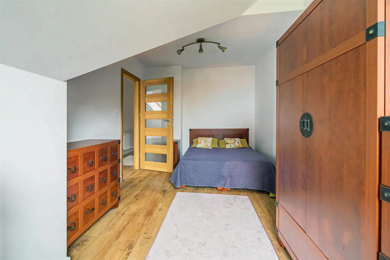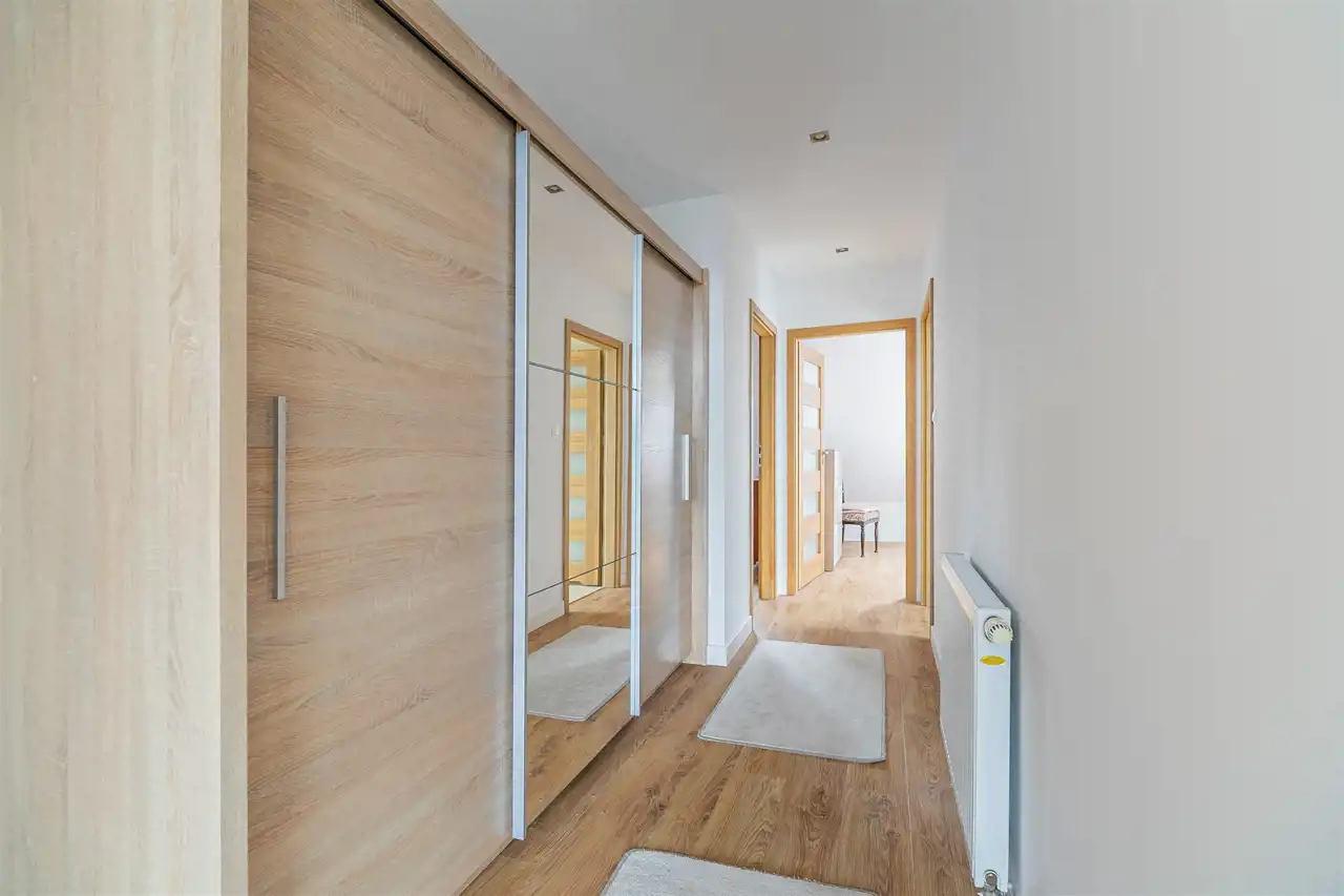 - Przedpokój: Przestronny przedpokój o powierzchni 4,1 m² z dużą szafą typu komandor.