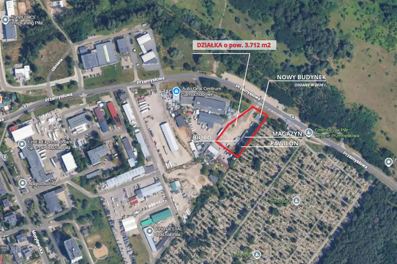 Na sprzedaż nieruchomość komercyjna stanowiąca w pełni funkcjonującą bazę operacyjną firmy z branży instalacyjnej wodno-kanalizacyjnej, położona w obszarze koncentracji zabudowy produkcyjno-usługowej w Pile, przy ul. Przemysłowej 9a.