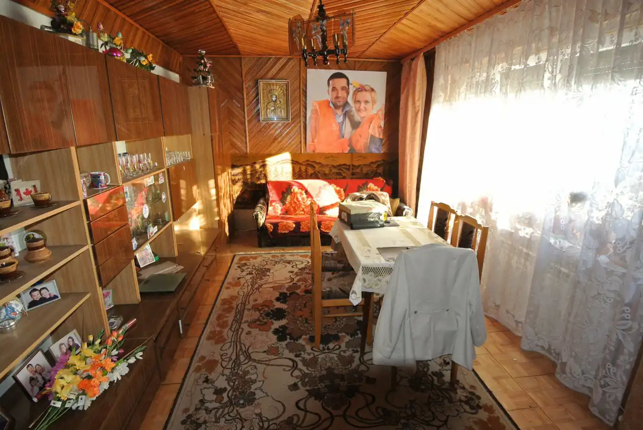 The house is in need of renovation, built in the 1980s from concrete blocks, partially insulated, covered with sheet metal, and heated with an oil furnace.