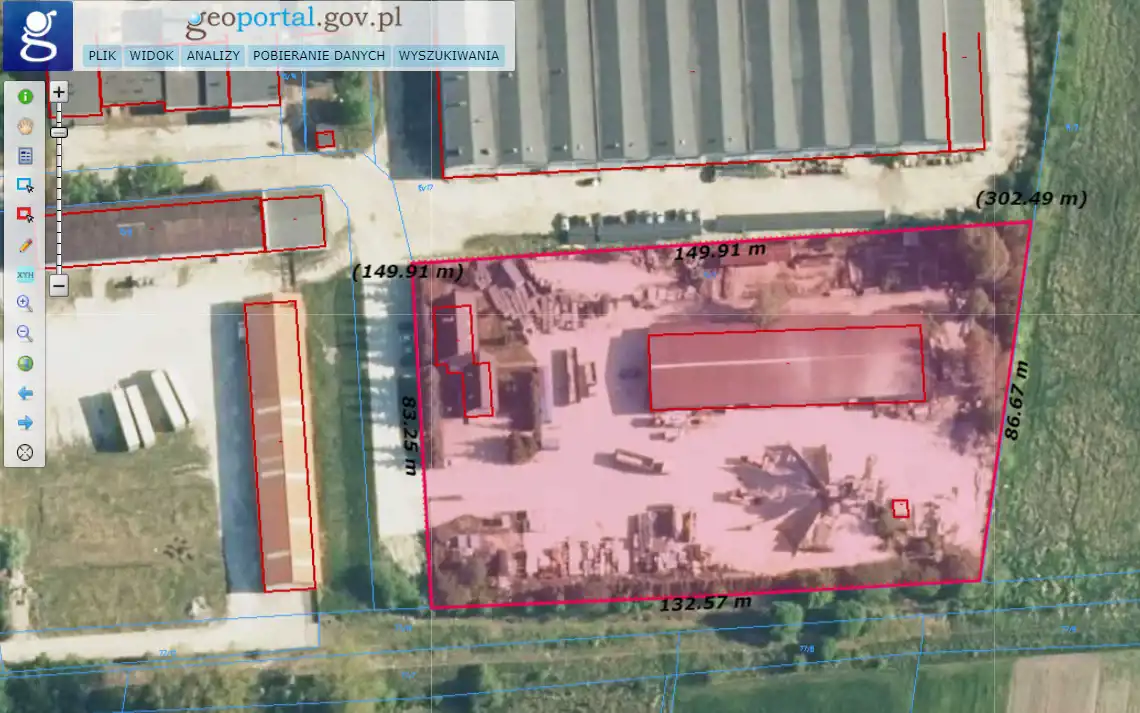 For sale, a plot of land with an area of 11,867m2 located in Pińczów. The plot has approximate dimensions of 83m x 132m x 86m x 149m, is flat, fenced, and landscaped, with access via a hardened road. On the plot, there is an office building with an area of approximately 270m2, a warehouse with an area of approximately 1170m2, and a functioning concrete mixing station with a concrete recycling system and a weighbridge for up to 60 tons.