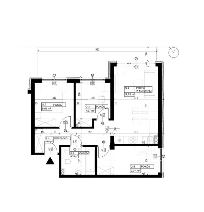 b) salon z aneksem kuchennym (pow. 17,75 m2),