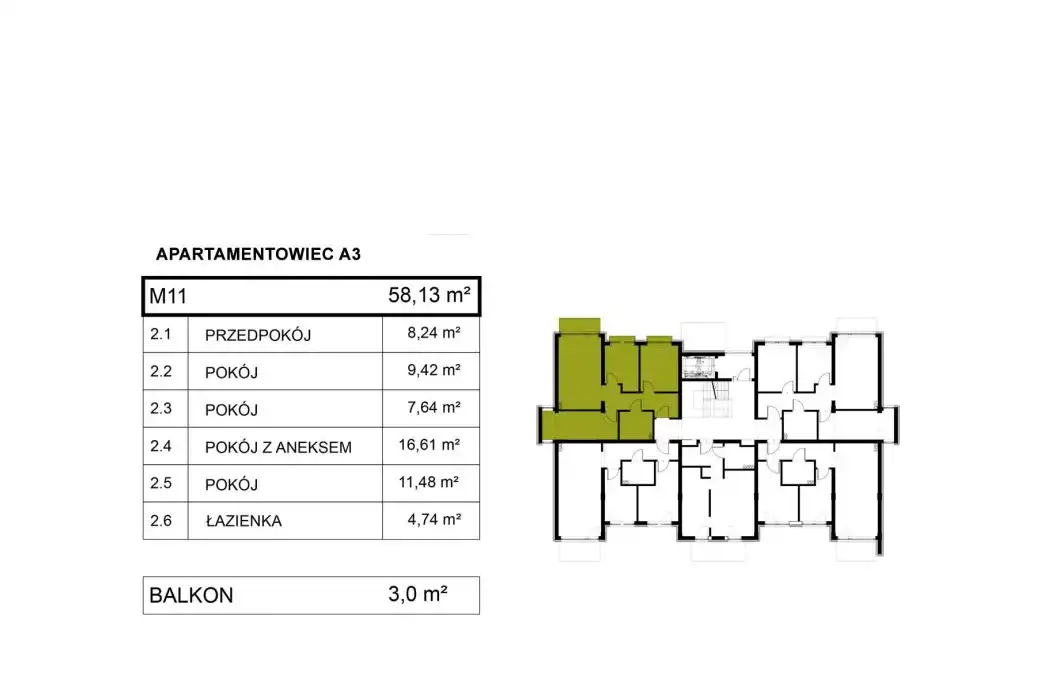 c) 3 sypialnie (pow. 7,64 m2, 11,48 m2, 9,42 m2),