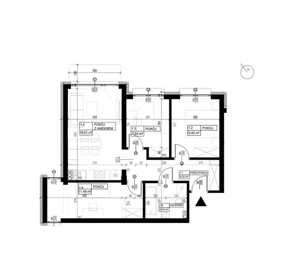 c) 3 sypialnie (pow. 9,42 m2, 7,64m2, 11,48 m2),