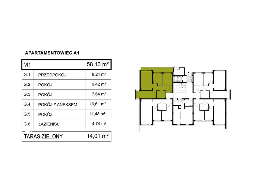Do lokalu przynależy zielony taras o powierzchni 14,01 m2.