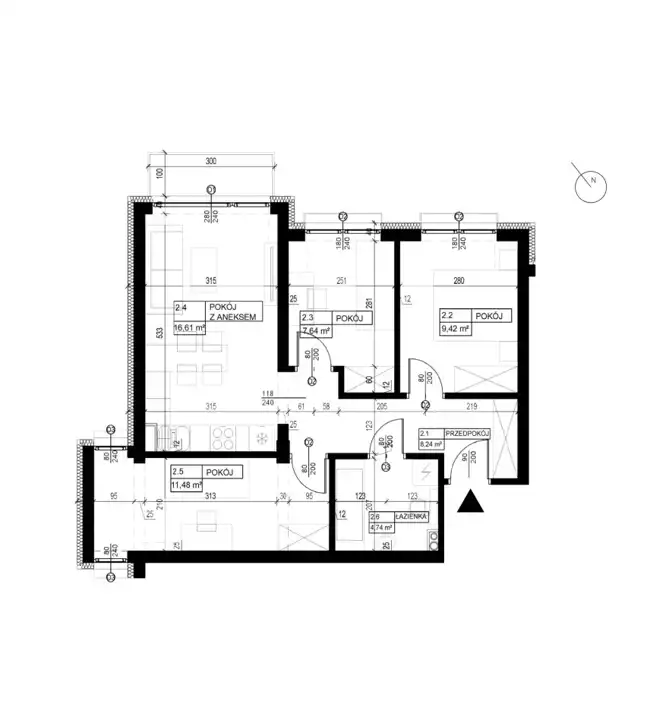 c) 3 sypialnie (pow. 7,64 m2, 11,48 m2, 9,42 m2),