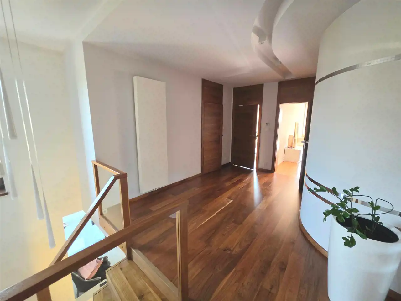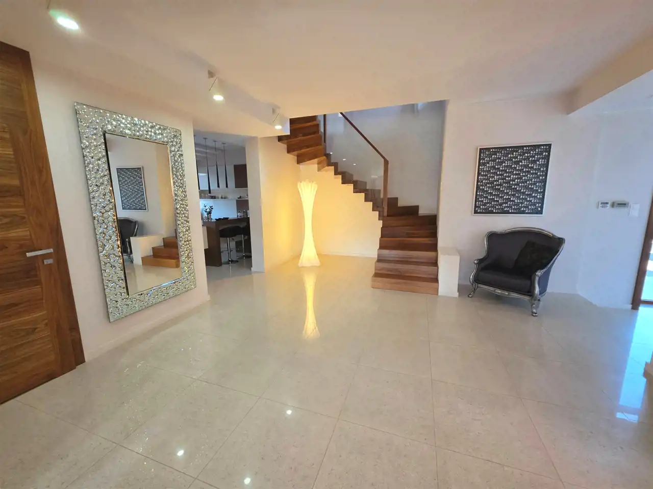 - Przestronny hol z reprezentacyjnym wejściem – elegancka ceramika, lustra, detale w drewnie orzecha amerykańskiego.