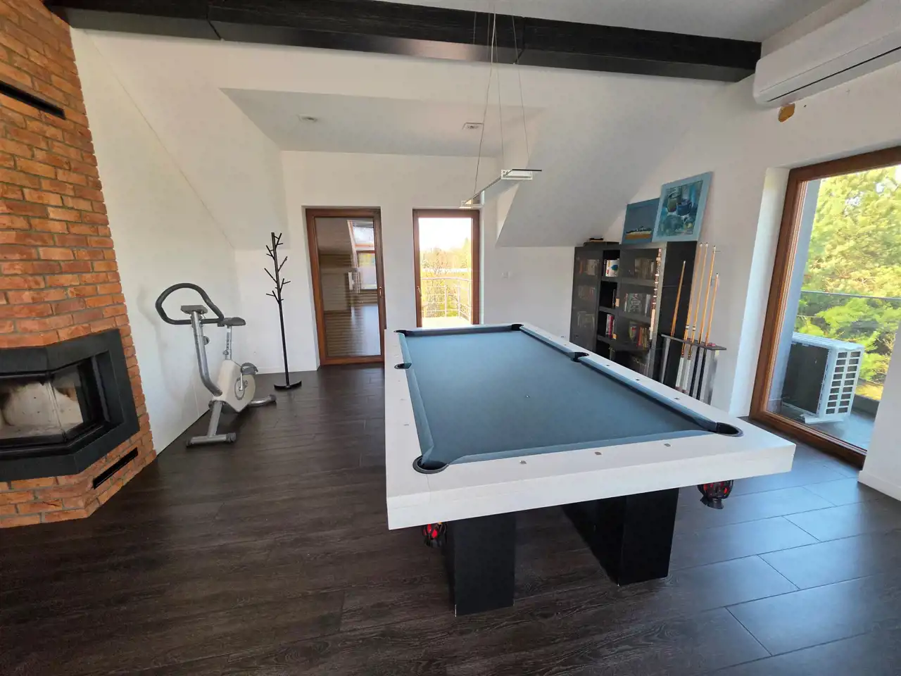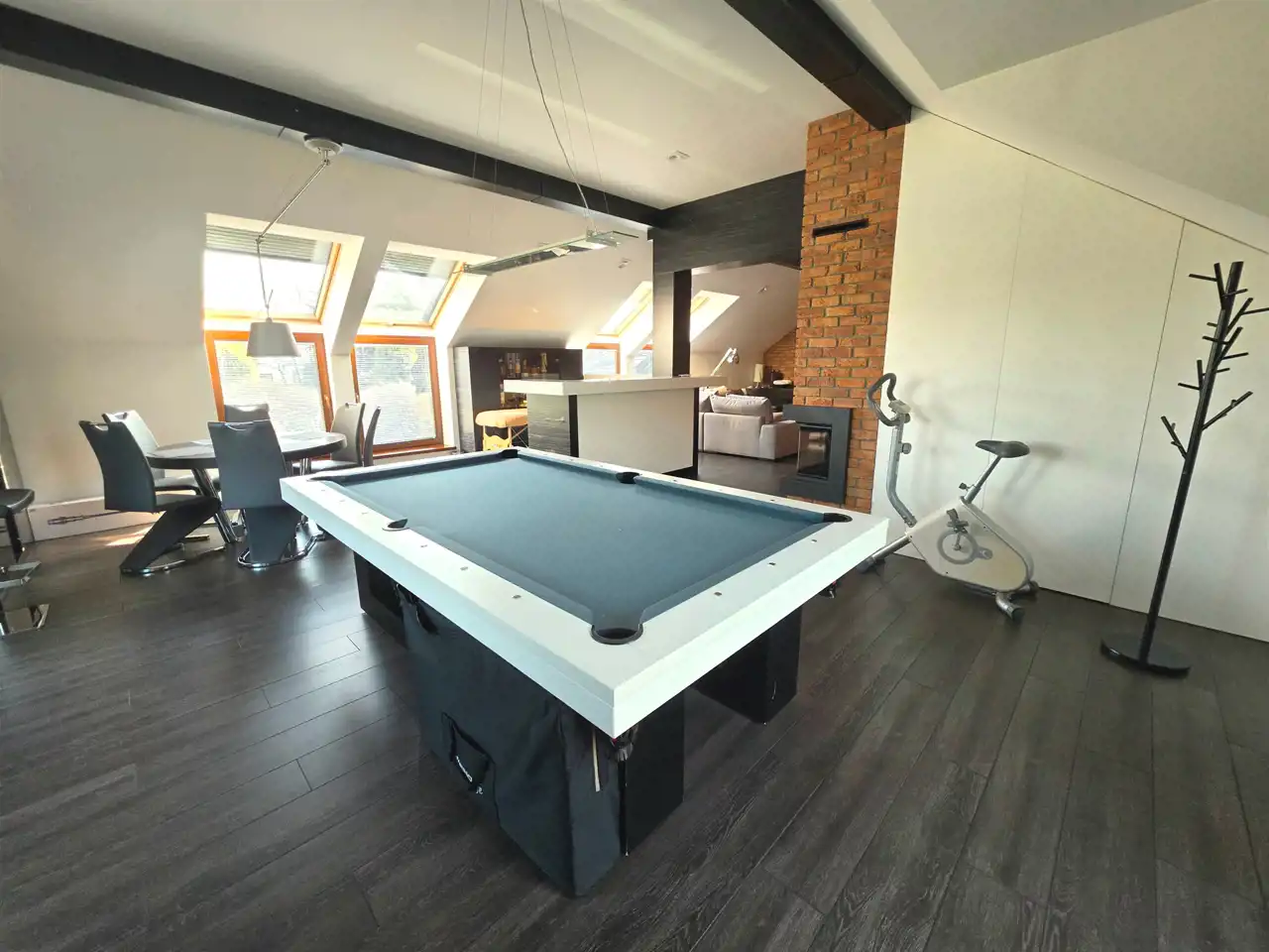 - Pokój rekreacyjny (70 m²) – przestrzeń wypoczynkowa z kominkiem, stołem bilardowym, barem oraz wyjściem na taras przygotowany pod jacuzzi zewnętrzne.