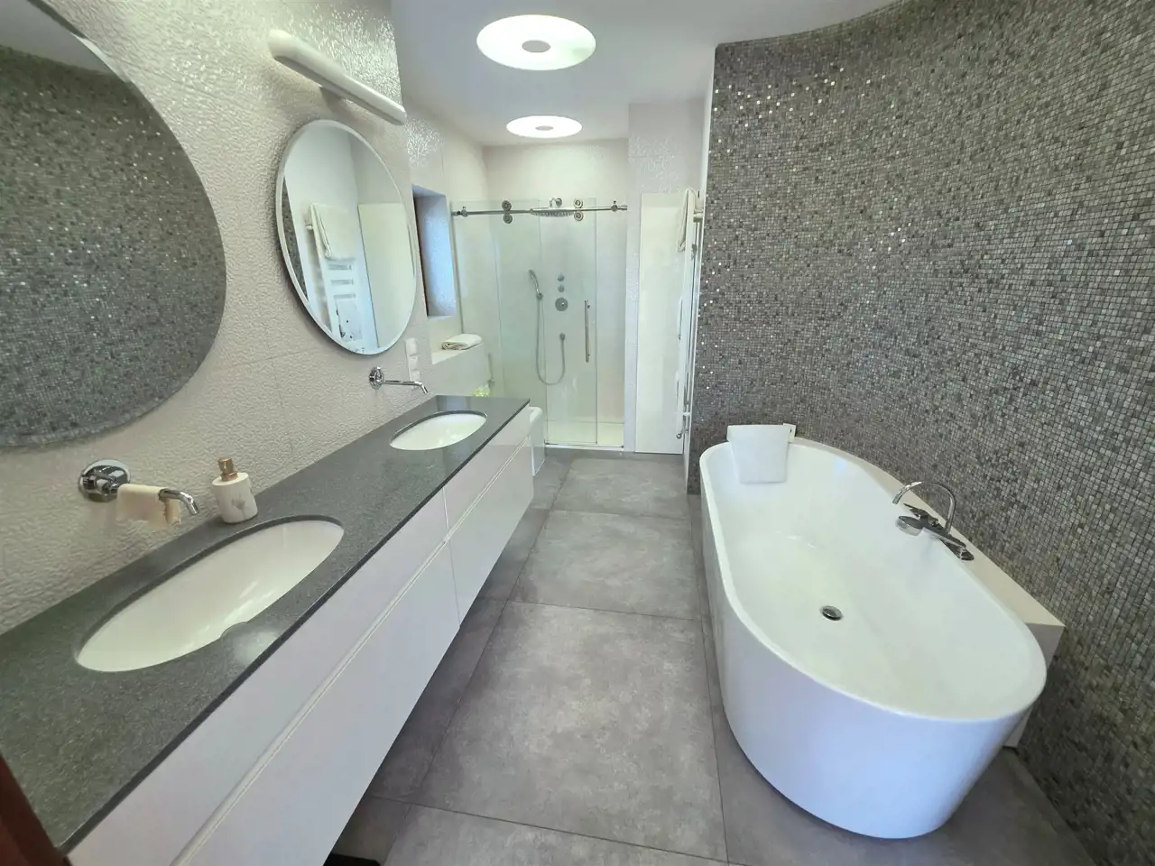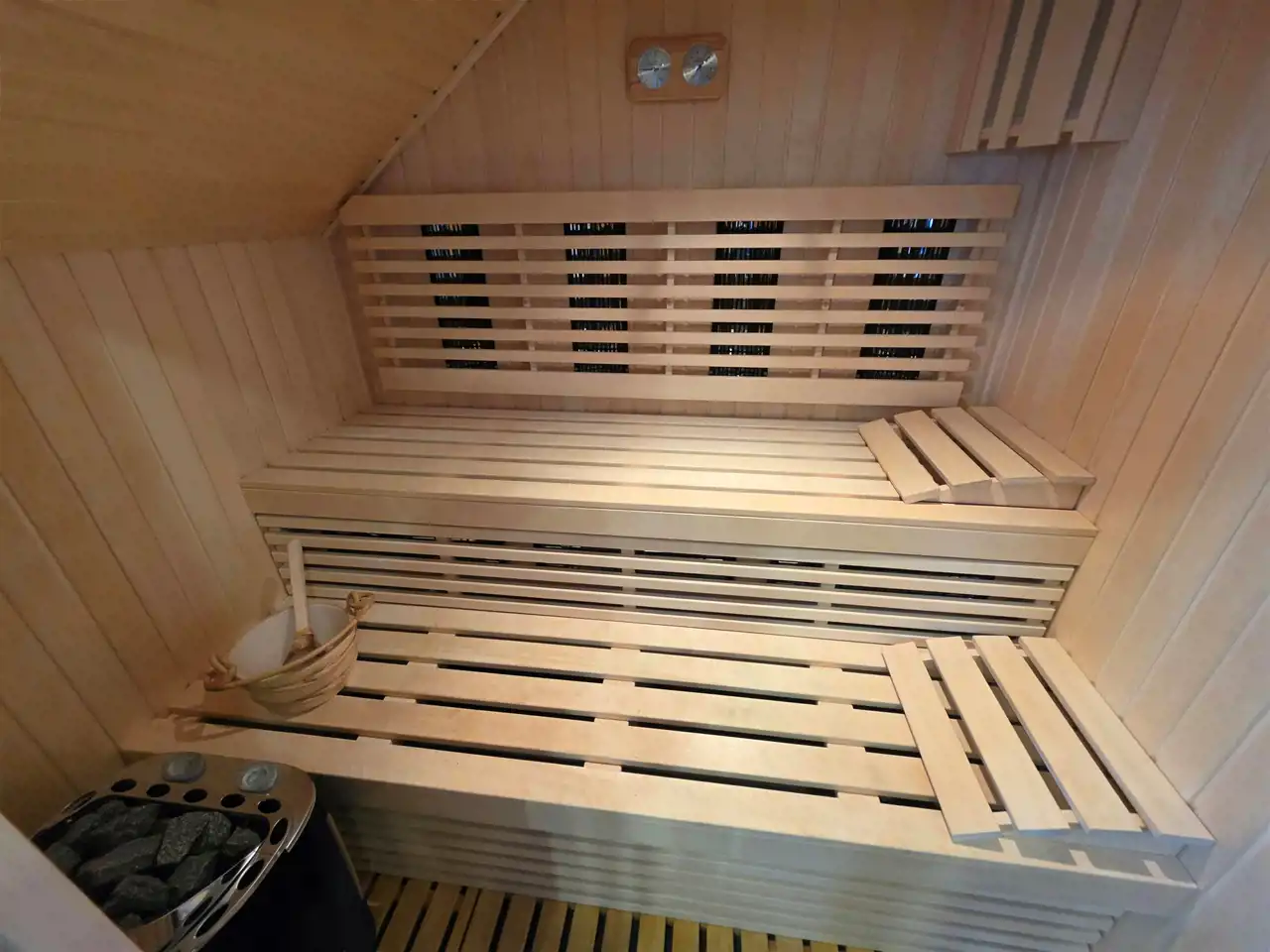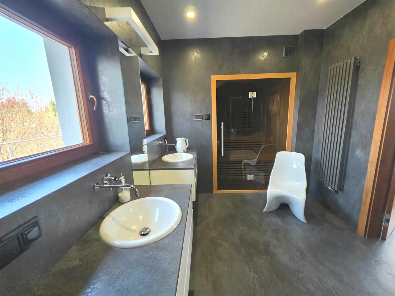 - Łazienka z sauną, wykonana w nowoczesnym stylu z naturalnymi materiałami.
