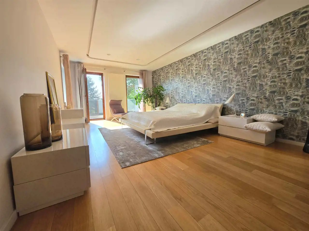- Sypialnia główna (42 m²) z prywatną łazienką wyposażoną w wannę i natrysk oraz wyjściem na balkon.