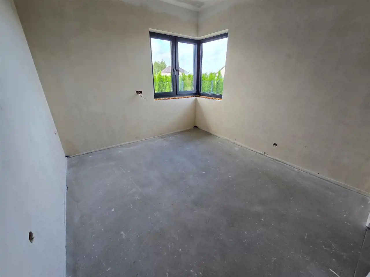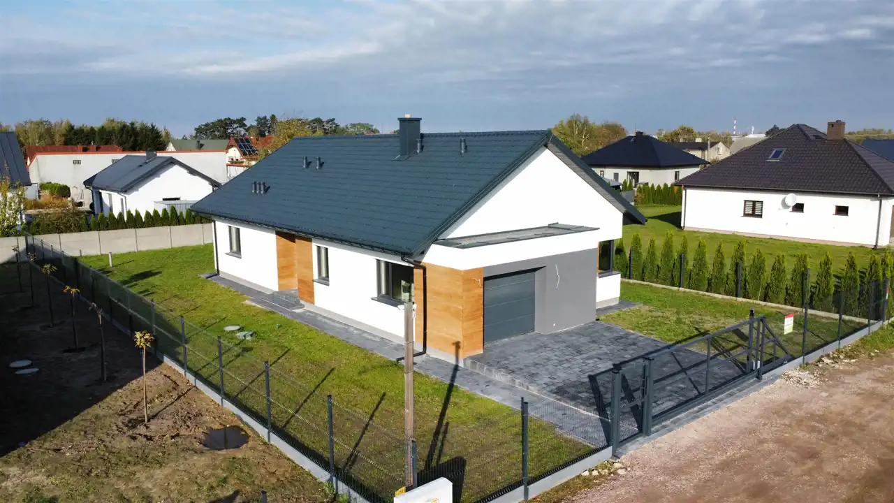 Wykończenie od zewnątrz: elewacja w systemie BSO ( 20cm ocieplenia) w estetycznie dobranej kolorystyce, opaska z kostki betonowej wokół budynku + podjazd do garażu i obszerny taras, ogrodzenie- siatka panelowa, brama na pilota.