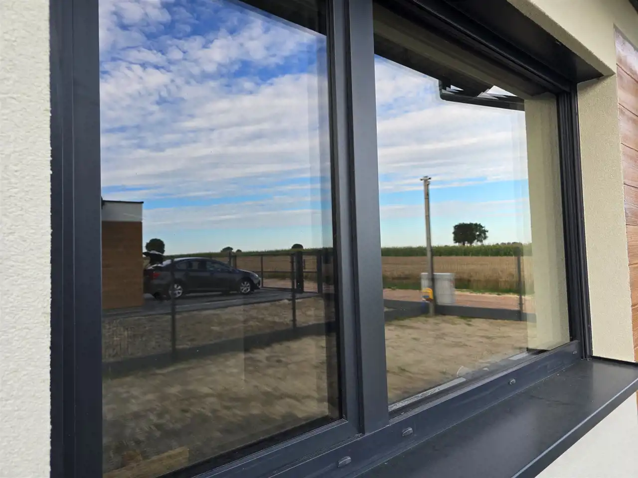 Okna trzyszybowe PCV. W salonie okna tarasowe przesuwne.