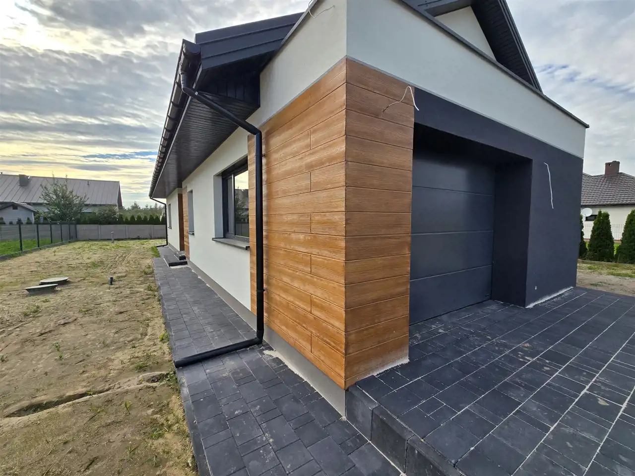 Wykończenie od zewnątrz: elewacja w systemie BSO ( 20cm ocieplenia) w estetycznie dobranej kolorystyce, opaska z kostki betonowej wokół budynku + podjazd do garażu i obszerny taras, ogrodzenie- siatka panelowa, brama na pilota.
