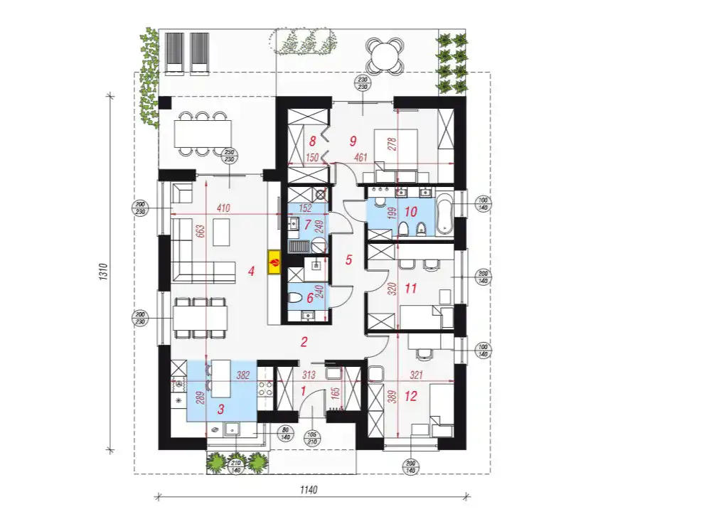 Trzy sypialnie, salon + jadalnia, dwie łazienki, korytarz, wiatrołap, hol, kotłowania.
