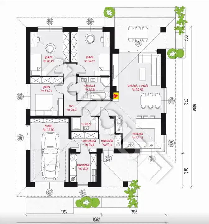 Trzy sypialnie, salon + jadalnia (37m2), dwie łazienki, korytarz, wiatrołap, hol, kotłowania.